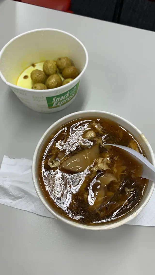 Snack Express嘅碗仔翅真係世界級!好足料,每啖都係滿滿嘅料,冬菇片大大片,木耳爽口,仲有粉絲嘅多重口感。而且個湯都好香濃,唔會太稀,但又唔會係羹咁樣,剛剛好。加埋麻油,真係好正😍😍,只係$19!魚蛋係陳皮魚蛋,彈牙,好食!$10 有8粒,有辣有唔辣!查看更多