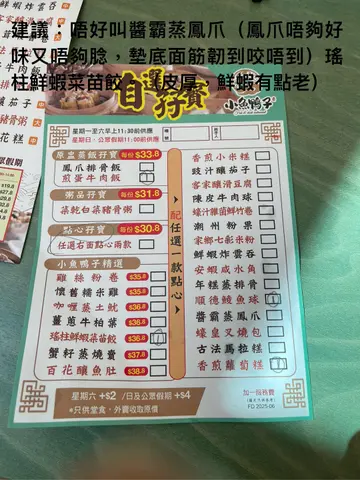 食物质素OK,性价比OK,环境气氛就一般,有些枱与枱之间只隔1块胶板(不足一米距离)!收银员的服务态度令人难堪,与客人对话时双眼上下眼皮明显灯大地望着客人,使客人不知如何应对! ?建议唔好叫凤爪和蒸饺,凤爪酱汁唔够好味,垫底面筋韧到咬唔到;蒸饺皮厚虾又有点老。…查看更多