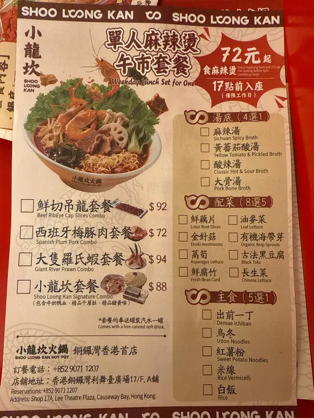 小龍坎火鍋 (利舞臺廣場) (铜锣湾) 网上订位享低至7折优惠并赚Rice Dollars 网址: https://s.openrice.com/QrLS0DI0F00 地址: 香港銅鑼灣波斯富街99號利舞臺廣場17樓A號舖 电话: +852 90711207