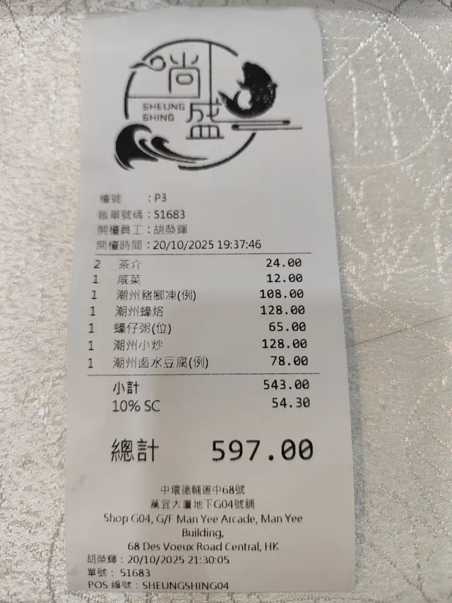 尚盛潮州海鮮飯店 (中环) 网上订位即赚Rice Dollars 网址: https://s.openrice.com/QrLS035OD00 地址: 香港中環德輔道中68號萬宜大廈地下G04號舖 电话: +852 28544557