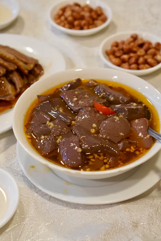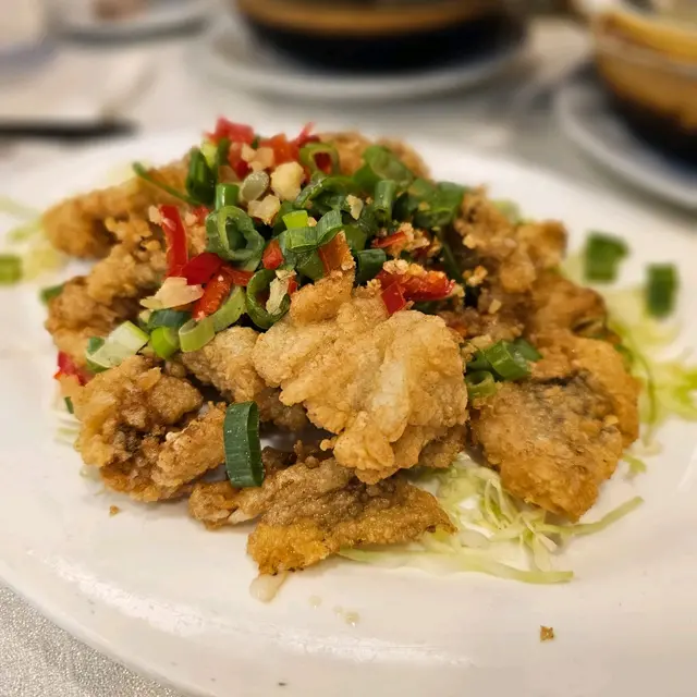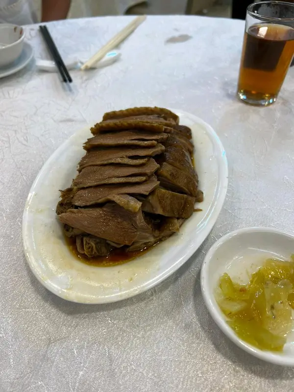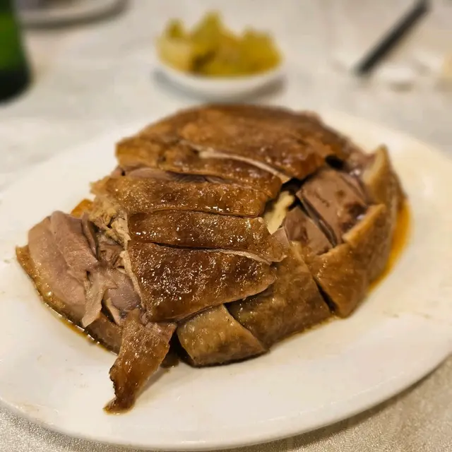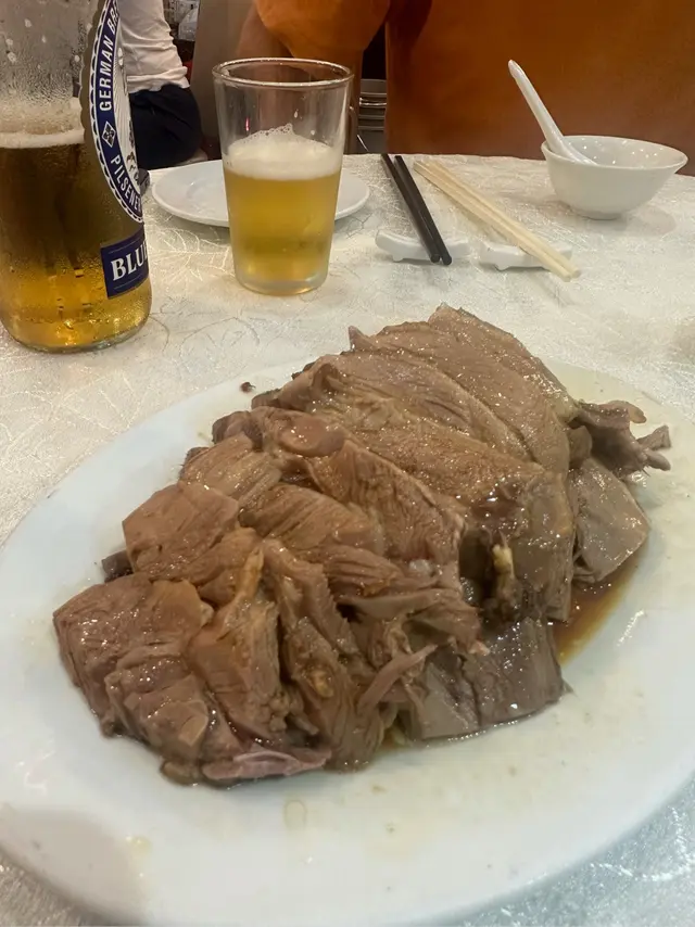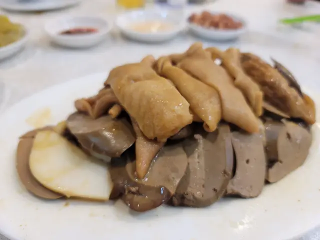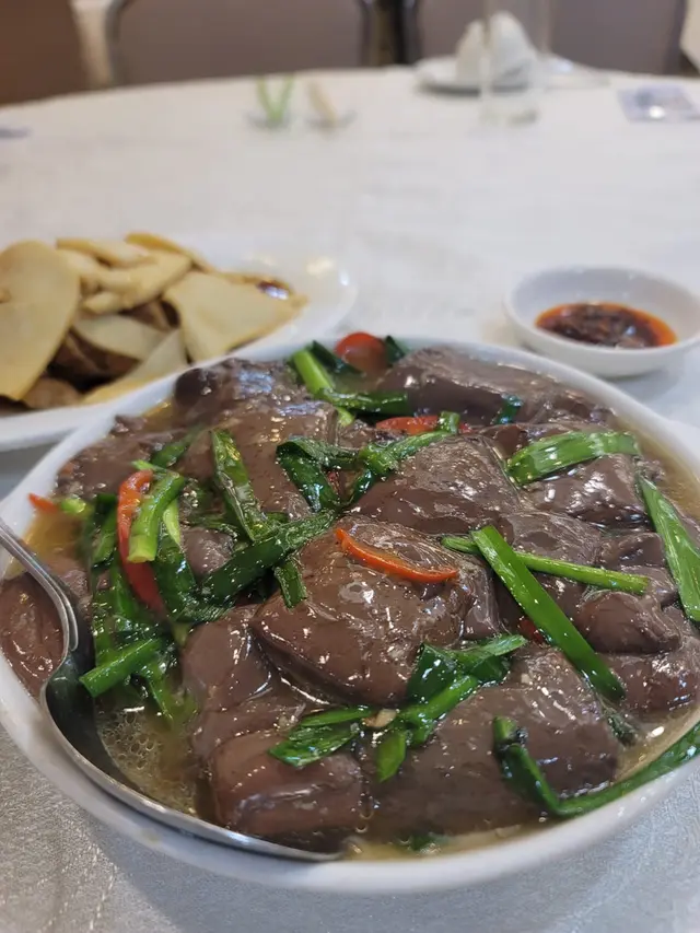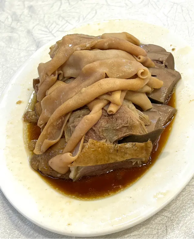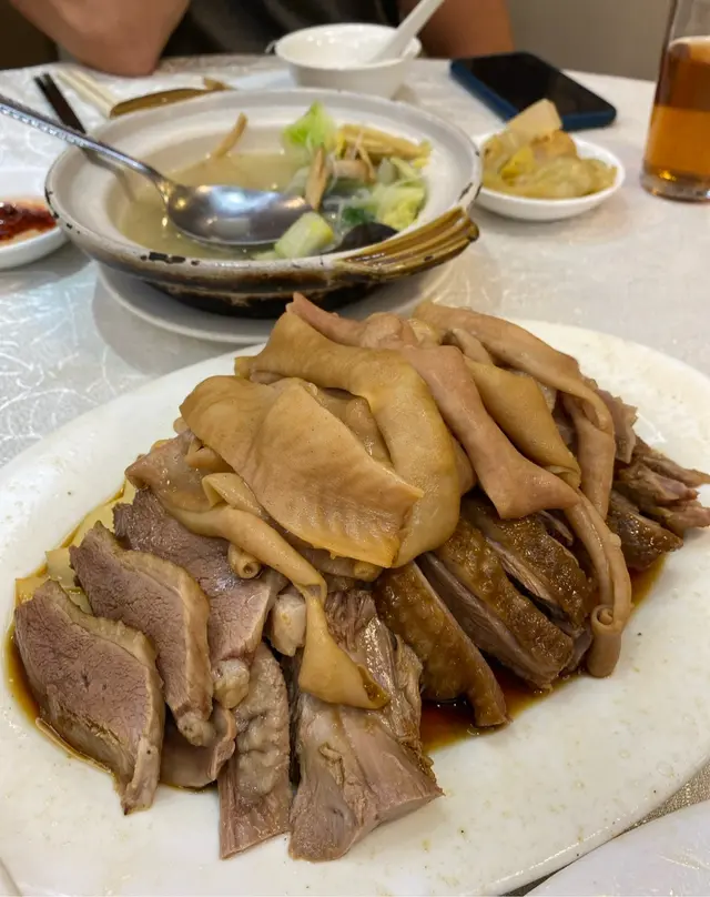 经过皇后大道西应该很难不注意到这家潮州菜。一连占据了三个门面,透着街坊酒楼的平实和老派。常能看见这边厨房出的菜往那边桌子端,生意好时不知店员每天要走多少个来回。虽然来了几次都没去求证三家是不是同一个老板,但好吃就行。·地处上环,价格确实比之前在红磡和港大吃过的潮州菜贵一些,经典传统潮菜基本都可以吃到,份量不过不失。服务都是上了年纪的叔叔阿姨,态度整体都蛮好,添茶很及时,甜品也会主动分舀。·【卤水拼盘】这天没有鹅肝,但我们选的鹅肉/豆腐/大肠拼盘也是极好的。大片大片的鹅肉透着润泽的光,吃起来紧致有嚼劲,均匀的纹理中渗透出咸香的卤汁,深邃的卤香与鹅肉滋淳的肉香浑然一体。·【卤水鹅红】滑嫩但不失质地,甚至有点让牙齿陷入其中的微微糯感,无腥味。·【果皮蒸白鳝】陈皮版本的蟠龙鳝,整体味美清淡,鳝肉不老,外层韧,内里柔软,细腻无腥,不过刀工可以更讲究点。火候也正好,汤汁中裹挟着鲜嫩的鱼胶,形成了一道微浓的自来芡。·【虾米炒汕头白菜】虾米个头足足有常见虾米的两倍大,给清雅脆嫩的白菜染上一抹豪迈的海味咸鲜。·【菊花石榴鸡】出于对名字的好奇浅尝了一下,也是清淡味型,但高汤是提鲜神器。软润的蛋皮捆扎成类似烧卖的形状,拖住沉甸甸的鸡肉糜。鸡肉细腻,混合了香菇颗粒好像还有笋丁,口感也挺有趣。·【福果芋泥】这一口热气腾腾的芋泥就是碳水与脂肪的快乐叠加。朦胧的粉紫色之下是幼滑细腻的质地,膏一样的厚实,舀起来的瞬间感受到明显阻力。芋香浓郁过瘾,比奶茶里的芋泥多了一股神一样的猪油香气,和着滚烫的温度扑鼻而来,回味悠长而立体。·【海蜇手撕鸡】接下来几道都是外卖回去的下酒菜。海蜇和鸡肉品质都不错,但调味比较清淡,用的应该是葱油,感觉还是川式的手撕鸡吃着更爽。·【川椒鸡球】跟川味沾了边,但其实基本不辣,肉质嫩滑弹,入味多汁,带点野性的焦香,菜叶炸得松脆挺立,虽说吸饱了油分有些腻,但喜欢这个口感反差。·【沙茶牛肉】其实是沙茶牛肉芥兰,芥兰新鲜脆口,但刀工依然是比较随意,大小粗细不够工整。牛肉腌得不错,大片弹嫩咸香,沙茶酱给得慷慨,能明显感觉到花生的醇厚。但越吃越稀,最后成了汤汤水水的质地,这道菜我更喜欢新忠记的版本。查看更多