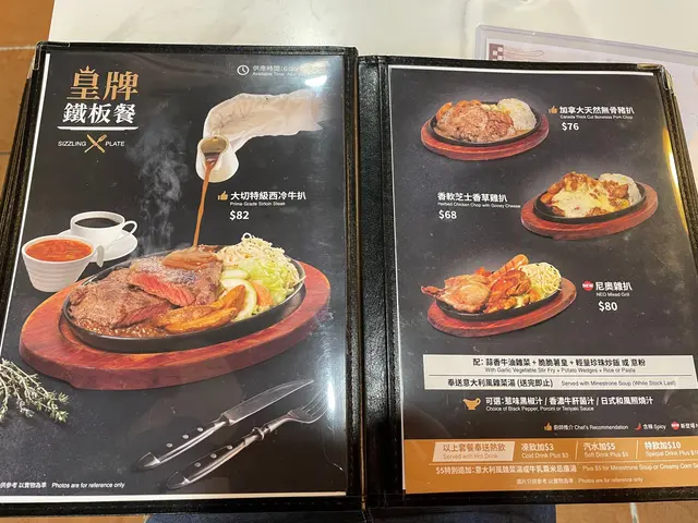 裝修過嘅尼奧餐廳 vkll125等级42024-03-232K 浏览 关注 鐵板大切西冷牛扒( $82晚市/$72午市)-大切厚肉,新鮮感欠佳,味道比較啞,多根,鹽份太重,遮蓋肉味,肉質鬆軟。跟桿菌汁,日式燒汁,黑椒汁。經典滋味鮮茄焗豬扒飯( $59 )-肥邊豬扒。肥邊口感幾脆,食落唔會反感。本地豬扒。佢哋另有嘅加拿大豬扒好同呢塊唔同。總括:餐廳質量能保持穩定,開咗好多年。餐廳比較繁忙,好多街坊熟客都會嚟呢度食。效率快。最近裝修完所以價錢又貴咗。佢哋有下午茶。值得推介佢哋嘅加拿大天然無骨豬扒,香草肉丸蕃茄扁意粉。…查看更多以上食记乃用户个人意见 , 并不代表OpenRice之观点。赞好分享裝修過嘅尼奧餐廳 尼奧餐廳 https://s.openrice.com/QrLT09kjH00检举 张贴 评分4味道3环境4服务5卫生3抵食推介美食加拿大天然無骨豬扒用餐途径堂食