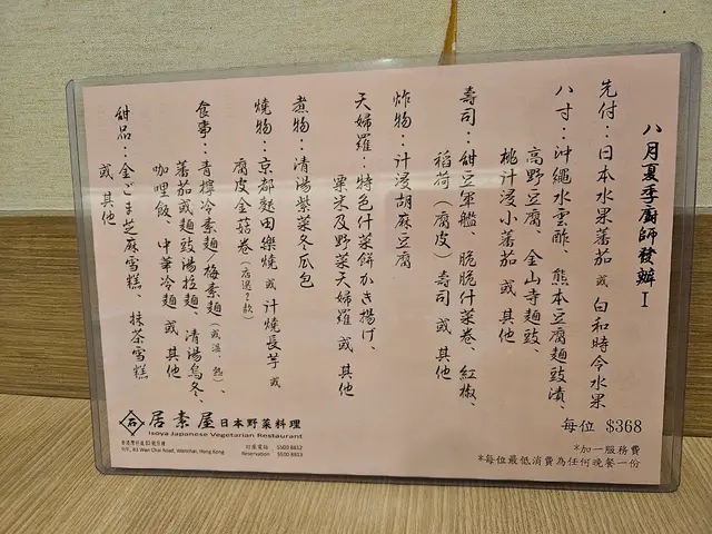 居素屋日本野菜料理 (湾仔) 网址: https://s.openrice.com/QrLS06xm200 地址: 香港灣仔灣仔道83號9樓 电话: +852 55008812