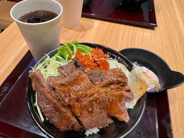 🐂鹽蔥牛小排燒肉丼 套餐 $65見到店員用切肉機切生肉,證明這不是預製菜;又不時看到廚房很大火,應該就是正在燒牛肉了。牛小排是薄切的,加上鹽蔥和燒汁撈飯,整體很惹味☺️🐓炸雞塊 跟餐+$0雞件外脆內嫩,呈粉紅剛剛熟,吃上口不油膩👌🏻🍋紅茶花伝 - 檸檬(檸檬紅茶) 跟餐+$2味道像沒有那麼甜的維他檸檬茶,不錯👍🏻🐂炭火烤牛扒燒肉丼 $75烤牛扒看上去帶點焦香,色澤均勻,但實際煮得過火,太韌了。雖然份量不少,但全都咬不開,結果好像吃香口膠一樣,咀嚼過後便要吐出來😫…查看更多
