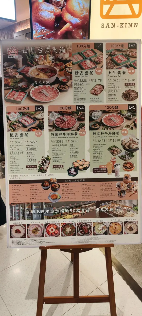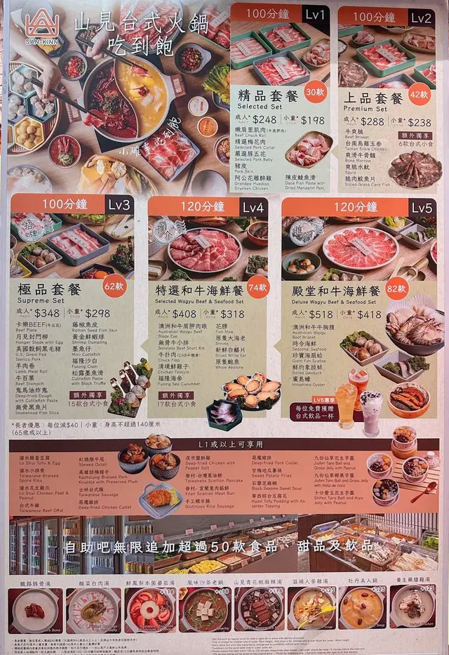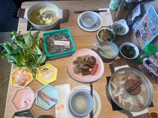 夜晚係屯門吃晚飯, 山見夜晚未試過, 所以試一下, 出奇地唔洗点等位😆, 有幾款套餐, 有d 吃100分鐘, 有d吃120分鐘, 我哋揀左LV3, 另外加$要左一個美人鍋, 一個藥膳養生鍋, 一人一爐真係幾好😋👍, 由於我哋是即興walk in, 所以並沒有使用openrice訂座優惠, 而且我哋也沒有citibank, 所以我無得扣80蚊😄, 唔洗好耐d水就滾, 二個湯我也有試, 可能我較喜歡藥材的香味, 我就比較喜歡藥膳, 飲落幾香😚, 美人鍋飲到太濃雞味, 我反而唔係敢鍾意, 外面有各三款冷泡茶🥤🍵罐裝飲品紙包飲品🧃同啤酒🍺, 亦有雪糕雪條蛋糕, 台式麵線, 台灣腸, 小籠包, 雞同鴨, 肉羹, 炸物, 醬料好多款可以自由配搭, 菇類🍄‍🟫亦有多款, 還有丸類, 麵有新竹米粉, 准山刀削麵, 王子麵, 菜有d講明係水耕菜👍👍油麥菜唐生菜通菜皇帝菜, 第一次見的☘️🪴🌿石斛苗同人參葉😅, 亦有芋頭, 蓮藕, 萵苣, 芋絲, 水蓮, 翡翠苗, QR code落單有豬🐷牛🐮羊🐑雞🐔, 穀飼豬唔錯, 海鮮的沙白, 墨魚仔同黑魚都幾好, 另外有台式小食, 例如醉雞卷,藤椒魚皮, 麻辣雞腎, 鴨血整得幾好食😋, 刀削麵浸左湯的味道幾好食, 手工餃🥟皮太厚唔建議叫, 還有台式甜品仙草紅豆花生芋圓, 愛玉紅豆花生芋圓, 豆腐花等等, 其實100分鐘好快過, 不過勝在他們人手足夠, 上菜收碟都好快手👍👍值得再食, 下次試下其他分店🥰查看更多