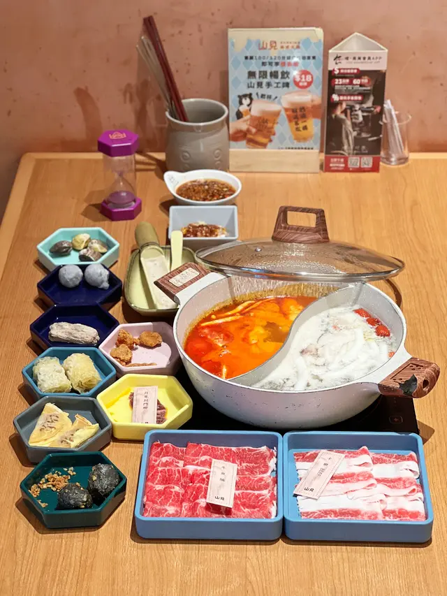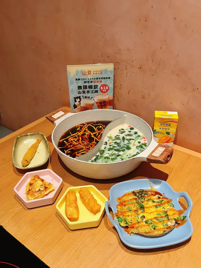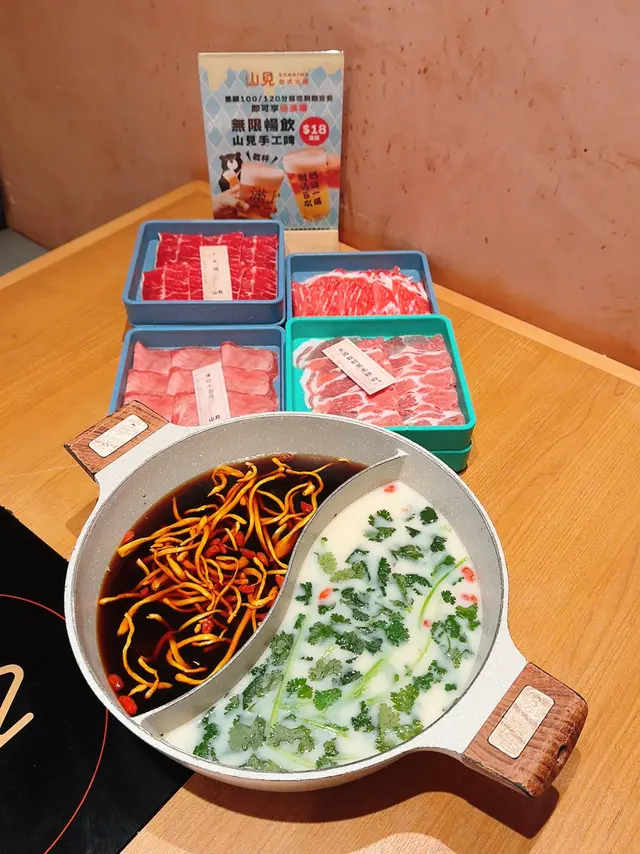 最近天氣開始涼,又到了打邊爐的季節!今次來到葵芳的「山見台式火鍋」😁體驗了一場結合了台式風味與港式情懷的吃到飽盛宴。🩵環境與服務餐廳的環境寬敞舒適,裝潢簡潔明亮,讓人用餐時感到放鬆自在。呢度貼心地提供了圍裙,避免用餐時湯汁濺到衣服☺️ 這個小細節非常加分!點餐方式是透過手機QR code,方便快捷。特別有趣的是,店家還提供了沙漏,提醒食客食材的最佳烹煮時間,既實用又增添了用餐的樂趣。🧡湯底與食材作為台式火鍋