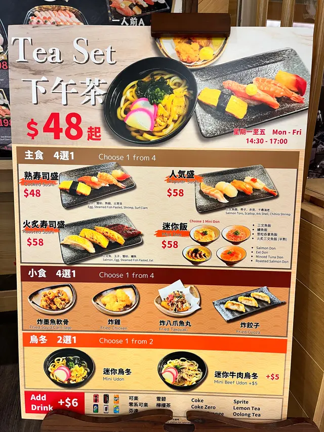 估唔到峰壽司都有出下午茶,雖然食評嘅食物質素好似麻麻,不過都試一次啦,點知非常有驚喜!TEA: 火炙壽司set + 炸雞 + 迷你烏冬 $58 (加埋一總共$64)火炙壽司一啲都唔Hea ,有鰻魚蟹柳玉子同埋三文魚,蟹柳玉子其實間間都差唔多,鰻魚有啲入口即溶嘅感覺,正 。迷你烏冬:正常發揮,雖然等咗一陣先食蛋都冇淋到,烏冬都入味,其實呢個份量剛剛好 。我等晒啲嘢食嚟,食完壽司同埋烏冬,最後先食炸雞,但啲炸雞依然都熱到食唔到,即刻炸非常欣賞!雞肉嫩!熱氣嘢食三嚿都非常足夠 。下午茶平日三點至五點,我覺得好抵 ,可見而家真係生意難做。查看更多