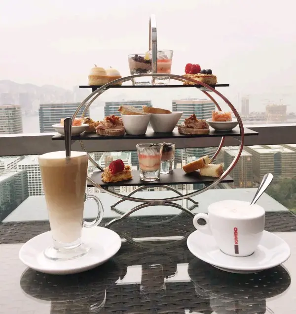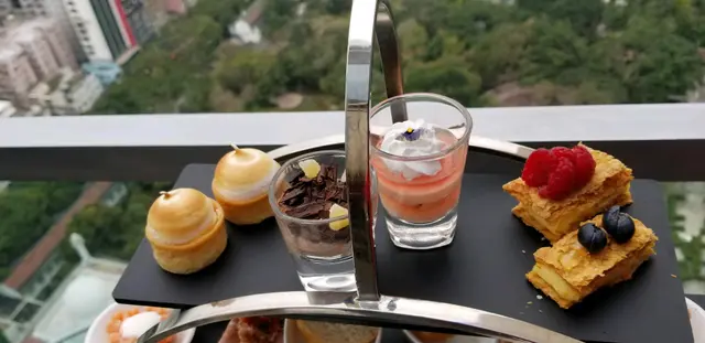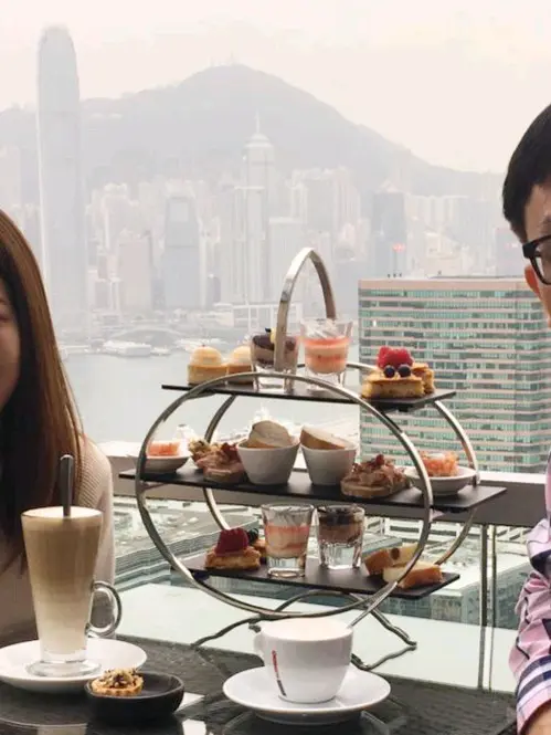 這店的下午茶點心架是幸福摩天輪,脫胎自英國貴婦餐桌上的三層點心架。沒有花枝,沒有道具,沒有場景擺設,沒有轉輪裝置,沒有異國情調,沒有嬌豔造型 ; 全因有凌雲的露台,露台上幾套簡樸的高桌椅,椅上有一個妳。點心架與網上海報十分相近,圓形的金屬架,配上黑色玻璃 ; 在桌面玻璃的映射下,它與天色共融,亦映入她的俏麗面龐。它比中環的摩天輪更接近天際,在灰矇的天氣下,觸手可及。它彷彿隨風流轉,訴說著我們的輪轉往事。此店的前世座落在山頂廣場,以峰景取勝,牛扒餐和生蠔兩大重點食物淪為配角。在那些年,情侶喜在此店共晉晚餐,即現在的「打卡」,取得存在感,認同感。當時妳是女主角,我連做配角的資格都沒有。🎡酸當年這種感覺是酸溜溜的。如今我們共嚐下午茶點心架,由左方酸溜溜的「蛋白檸檬撻」開始。蛋白檸檬撻有厚厚的酥撻墊底,很有質感,外型像學校的閙鐘,令我們聯想到書卷味的日子,酸秀才的酸味與檸檬蛋白的濃酸交纏在一起,酸得令我有點兒心酸。它擺設在上層的左方,寓意由此入門,酸味令饞蟲活躍,增加食客的意慾。我倆覺得倒有需要,因點心份量十足,要在此消磨4小時才能消化掉,平均每20分鐘食一件。下午茶點心架套餐十分抵食呢 !第二份茶茗是酥餅。撻如面,宜薄,勿有飽腹肥膩感覺 ; 酥餅如心,宜多層細密,輕鬆,空間足。「藍莓千層酥」號稱千層,卻遠不及生果拿破崙的脆皮甜蜜,始終類型,價格不同,不宜強比。「紅桑子千層酥」則十分討好,有草莓的驚世紅豔,有適度的酸味。世人多鍾情紅莓,把她許配給蛋糕酥餅,忽略其嬌小妹妹,她潤喉補眼,更不會酸溜溜的。紅桑子啊 ! 我欣賞妳,我們都被人忽略,命運類同呀 !🎡咸第二層是咸點,分兩類。食美饌如交友,宜由淡漸濃。我先食「燒牛肉伴檸檬黑麥包及煙肉醬」,名字很長,其實是燒牛肉麥包片。伊人負笈法國,對此物十分熟悉。她說煙肉醬調教得不出衆,令牛肉片淡而冰涼,麵包的質感和新鮮度亦強差人意。宜化為細片和疊起分層,淡化西式粗豪味,令味蕾感覺到有層次的觸碰。她仍是那麽執著,在寒風中,坐在高凳上,是鐵娘子,是銅像而不可靠倚。「芝士大蒜千層撻」卻令我十分驚喜。芝士,蒜味濃郁細緻,繞蕾三匝,千層鬆化感技勝前者的千層酥,份量纖纖,配合她的櫻桃小嘴。🎡鮮女士多鍾愛粉紅色,「煙三文魚他他伴牛油果醬」能獵取她的芳心。煙三文魚被切成細蓉,光潤如鮮三文魚 ; 他他醬如銀髮白絲,令她更有味道風韻 ; 牛油果醬厚厚的,如曳地翠裙,亦如她的裙下之臣,爭著來配合她的口味。原來牛油果和三文魚是天鮮配,清新可人。「鮮蝦蟹肉醬伴香脆法包」亦是大份量的,法包不大,醬則滿載一小杯,告訴我們蝦蟹肉才是主角。蝦蟹肉咸鮮度強烈,恰似彿面海風,恰似夾送海水味。法式長包在卿卿嘴前班門弄斧,稔而乾,亦不新鮮,不合格。🎡甜五時許,暮色漸深,食到第三層。「牛油蛋糕」是尋常物。「黑朱古力慕絲伴豆蔻黑糖」是整個點心架最甜的茶點,留下絲絲甜蜜。現時流行偏淡甜的,所以「玫瑰士多啤梨果凍杯」才是甜品之花魁。雖有士多啤梨,卻一點兒不甜不俗不漏不濃不假,反有清香果味,令我們酣暢淋漓,滋味無窮。翠袖搖曳,她以飄洋人評此套餐,覺得頗對勁,沒有英國式痕跡,微有巴黎風格。十茗味盡嚐淡,濃,酸,甜,酥,咸。願妳的一生都淡定情濃,由酸漸甜,甘飴咸豐。更願與妳同坐人生的幸福摩天輪,高高低低,寥落時為你摘星於高空。正如此華厦名稱,誰是妳的The One ?鄰新尖東一酒店有摩天輪下午茶供應,既不露天,金輪只是背景擺設,與食物無任何關係。🎵🎼幸福摩天輪🎼🎶甜甜飴飴,酥酥迷迷。矇矓中海水味與魚味相隨。「唯一」中露台登高,點心十味,味蕾中驟來蕩去,無匱無慮。一點心意流連在摩天輪,在峰景遙望維港流動。酸溜咸鮮在口腔互湧,濃淡甜跌蕩,有迎有送。當點心似流連在摩天輪,在卿瞳孔,在小嘴流動。啖茗飲啡如吻到星空,有你不怕溫低,忘記風凍。🎡晚餐下午茶是特價時區,每位只花費168元(包一杯飲品)和加一費。其餘時間俾人感覺價格頗貴,景靚物非。其實價格很克制,侍者服務如酒店。在主餐牌,如有策略地挑選食品,性價比仍高。下午茶客只可坐至18:00,正是華燈初上時。在露台和她續坐,正是我的鬼主意。拉下夜幕,換了背景,灣仔至西環璀璨燈飾迷惑了久在異鄉的她。室內的格調也像法國貴婦,不昏暗,線條簡約,配合店名,有藝術風格Art Deco。室外才有冷豔的「峰景」,才是食星光晚餐。晚市套餐有平至208元的炸雞卷,包藜麥沙律和甜品。要食得有質素,除吃牛扒和即開生蠔外,宜參考下列二人共享浪漫餐單,花費627元和加一費,每人付345元而已。橙金色的龍蝦湯馥郁濃稠,如醬似粥,令人齒頰留鮮,80多元不昂貴。主餐牌加配價98元的香煎鵝肝亦便宜,比晚市套餐加配價便宜了20元。香酥醉人,外脆內軟,味腴甘甜,這位法國少婦亦感愜意。主菜我們食澳洲羊扒,268元有5件羊鞍,不同凡香,只有輕微羶味,大量腴甘滋味,感到幸福滿盈,身也溫暖了。夜已深,她的第二個胃飢腸轆轆。我冒險地為這個旅法人獻上「法式焦糖燉蛋及火焰冧酒」,熊熊烈火令她饞涎大滴,淡黃冰「湖」泛起漣漪,映襯她的貪嘴和粉面。「冰」脆甜,在小嘴崩裂有聲,帶來微熱 ; 燉蛋芳香雪凍,冰火交戰,迂迴盪漾,歷久不散。份量大,95元不貴。壓軸是Matcha Fondant抹茶心太軟