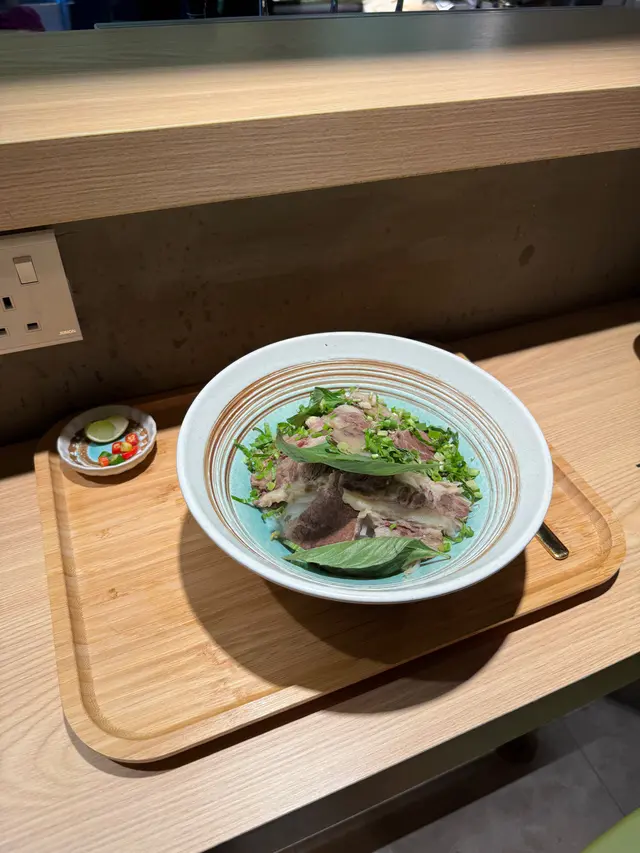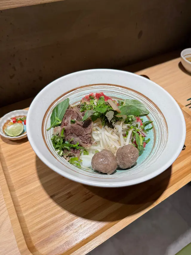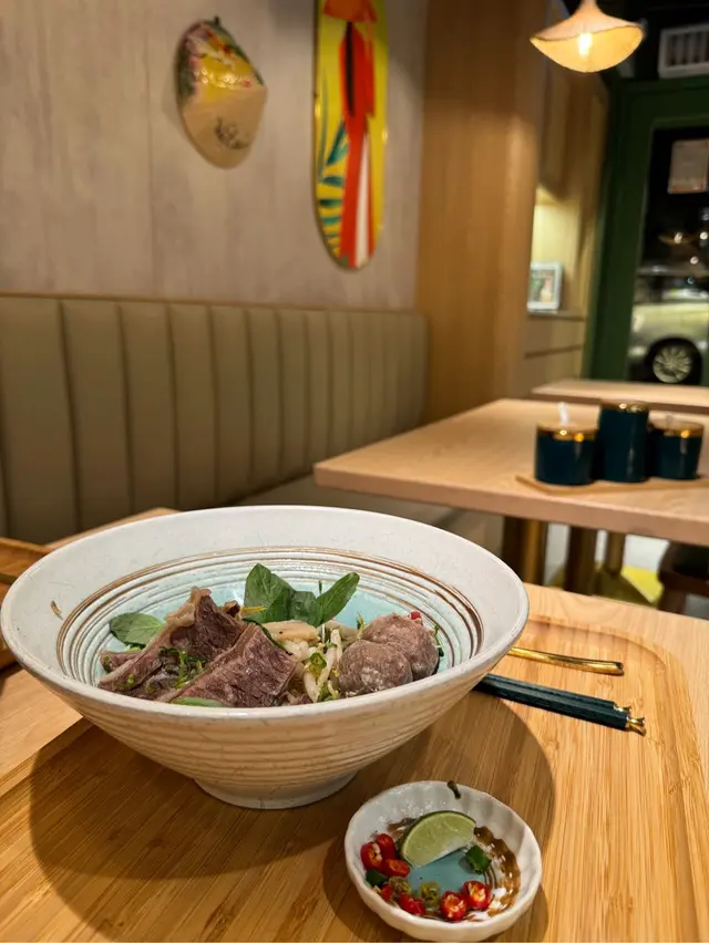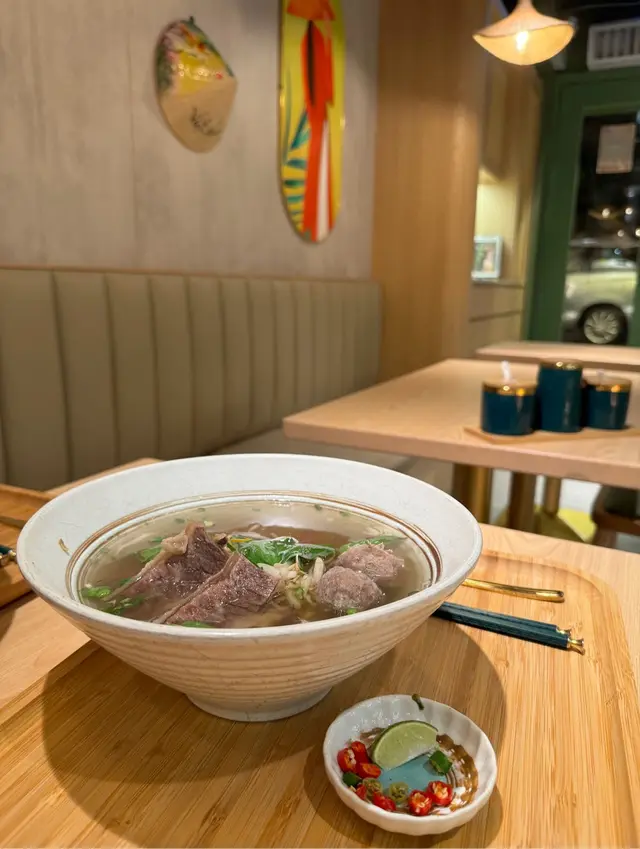 座落喺街角嘅小店,門口亁淨企理悅目。去佛教醫院經過幾次,今日中午剛好有時間嚟試吓。入到嚟,中間喺綠色主導嘅酒吧區,座椅落喺兩邊。環境衛生乾淨加上好relax嘅裝飾,舒服寫意。叫咗騸牯牛肉同崩沙腩檬粉,上台時用湯壺倒入滾熱辣牛骨上湯。湯頭帶清甜可口,冇用味精,騸牯牛肉同啲崩沙腩,食到濃濃牛味鮮甜可口,好新鮮,成碗湯冇理人,清晒一滴無剩。個人覺得比油麻地「越發」更勝一籌!叫咗個越南滴漏咖啡,煉奶分開上,細心。佢採用最濃(度)級數嘅咖啡,上嘅時候,店員有提過,個人感覺比一般街外嘅越南咖啡濃烈好多,苦味稍重。喜歡pho的,呢間一定要試!查看更多