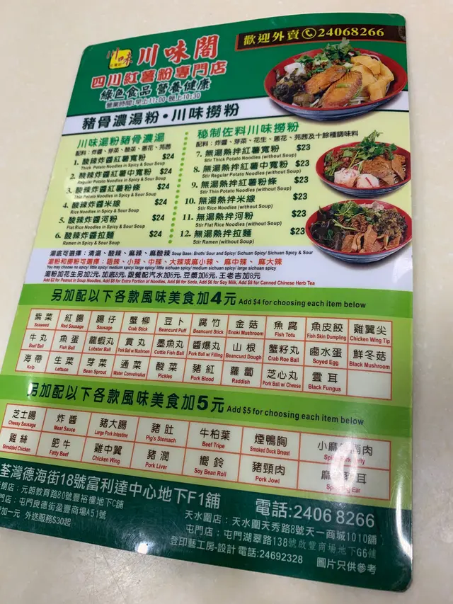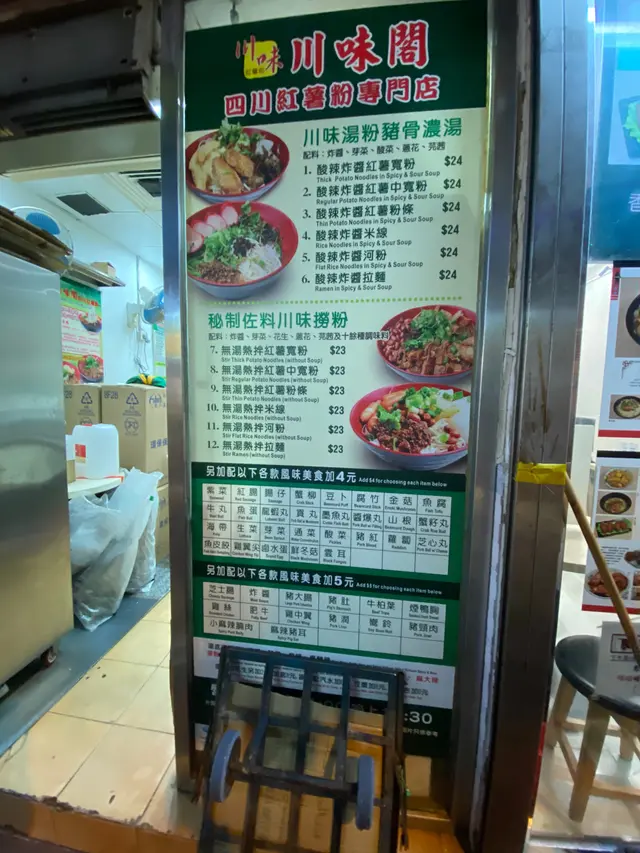一次去荃灣諗住去吃馳名已久的米線,但看見長長的人龍排隊,轉戰其他地方食米線。在轉角見看見有一排小店。其中一間便是川味這間川味美食。雖然小店只有六張枱,而且在疫情下很少機會能夠搭枱。一進去便比Menu上的價錢吸引了,米線或薯粉只售23 蚊每樣餸只+4或5 蚊,我隨口嗌了通菜豬頸肉,而女朋友就叫了腩肉豬肚。來的是是大大的一碗米線,雖然叫了小辣,入口十分10分濃烈,口腔充滿濃濃的酸辣勁味10分過癮,雖然餸嘅份量唔係話超多,但係卻剛剛好。食完碗米線之後係10分滿足而且飽肚,睇返買單唔使$70超平!係平民美食!係用餐期間我見到好多人買外賣,所以係一間好忙碌嘅小店。下次經過會再來吃。查看更多
