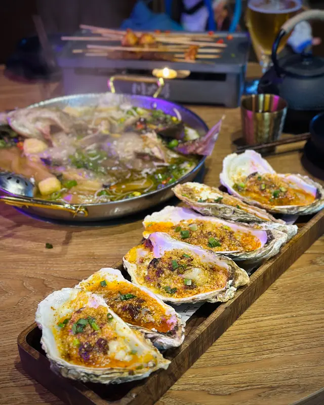 本身係想食燒烤,之後搵到呢間嘢,望一望地圖,見到佢個位置喺深水埗同太子中間,開頭都諗緊會唔會太遠,諗緊要唔要過嚟,但見到好多人都話呢間好食,所以就決定過嚟,嚟到出奇地覺得氣氛幾好!絕對要啤啤佢!成個氣氛係好適合傾偈吹水!最後叫咗烤魚同埋燒烤拼盤,佢個燒豬肉。又估唔到出奇地好食!本身諗住打埋邊爐,但係真係好飽,低估咗條魚嘅威力。。條魚真係好大條,不過最後都叫咗個響鈴,仲要係即炸嘅!所以都要試一試佢。不過美中不足嘅個烤魚嘅湯底好多人,搞到最後好似食緊油咁。不過整體嚟講都OK!好食!!…查看更多