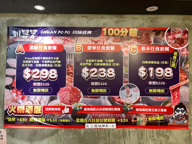 👍🏻頂級任食套餐 (100分鐘任飲任食) $298火鍋燒肉同時食👹!川婆婆尖沙咀分店主打麻辣串串火鍋,分款三個價位$198、$238、$298另外每枱只要加$30仲可以同時食埋燒肉放題🤪我地揀咗A餐$298頂級任食套餐,肉類包括Prime安格斯牛頸脊、牛小排、牛板腱、牛肩胛及封門柳、法式羊扒、以及自助區任飲任食-🔸火鍋湯底 (鴛鴦鍋 +$30)有三款湯底可揀,店長推薦我地招牌麻辣鍋配古法胡椒豬肚雞鍋麻辣鍋係典型四川麻辣,可揀辣度,小辣啱啱好唔會太過熗辣,花椒麻香濃,啱晒重口味人士胡椒豬肚雞鍋比想像中濃郁,幾有驚喜😮有幾舊雞件同豬肚滾湯,豬肚好食,胡椒入味,爽滑唔韌,乾淨冇異味兩款湯底烚完啲嘢食唔使點醬汁已經好濃好夠味-🔸肉類及火鍋配料套餐嘅牛肉需要同店員落單,出餐份量都俾得好足,上枱速度快,可以食足100分鐘😎整體質素唔錯,油花色澤比起自助區肉類靚啲,牛味香濃,冇雪味解凍狀態都OK另外比較有特色係自助區提供多款串串,例如羊肉串、牛肉串、金菇肥牛串等,俾你隊晒入鍋烚吓烚吓亦有多款基本火鍋配料,魷魚、丸類、各款蔬菜、豆卜、午餐肉、芝士腸等等-🔸燒烤 +$30/每枱自助區醃製好嘅肉類可以用嚟燒烤,例如雞翼、豬頸肉、雞肉、豬扒、雞軟骨等等,當然唔少得A餐獨有嘅羊扒整體醃得比較濃味,孜然味同辣味較突出,煎到焦脆,爆發油香😈火鍋串串都可以拆出嚟炒香,自己灑上辣粉同孜然粉調味,又係另一種食法-幾欣賞佢一邊火鍋一邊燒肉嘅設計,可以滿足所有朋友嘅喜好😌仲要係每枱加錢而唔係人頭計,適合鍾意食辣重口味人士或者食肉獸們-味道:7/10性價比:7/10-📍#川婆婆 @chuan_po_po尖沙咀寶勒巷26-36號地舖查看更多