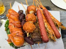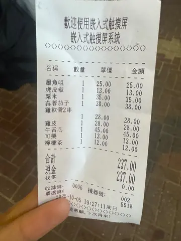 为食🐑钟意食串烧,今次喺荃湾发现咗呢间串烧店,串烧主打川式风味,但调味拿捏得恰到好处,唔会死咸死辣。点咗小辣,确实系小辣,好啱想浅尝川味嘅朋友,其中我最钟意食嘅系鸡皮同鸡软骨!🤍 墨鱼咀 $25口感爽弹鲜味十足,烧得时间控制得刚刚好。🐔 鸡软骨 2串 $28金黄香脆嚼劲十足,系我每次必点嘅心水之选!🐔 鸡皮 $28烧到焦香脆口唔油腻,食落卡滋声真系超满足。🐃 牛舌芯 $45牛脷使用平时茶餐厅嘅厚切牛脷,软腍多汁,使用简单调味已经非常之惹味,啖啖肉!💚 虎皮椒 $13外皮微焦带点虎纹,内里清甜多汁好开胃。🌽 粟米 $35烧到金黄香甜又多汁,加咗少少味粉,但食落仲保持到原汁原味。🍆 蒜蓉茄子 $38茄子真系原条好大条,上面铺满金黄蒜蓉香气扑鼻,茄子肉嫩滑又多汁,最重要唔会烧到干争争!🥤 可乐 $13🍹 柠檬茶 $12✨ 整体串烧味道都唔错!现场所见,外卖单好多,睇嚟深受街坊欢迎。下次想喺屋企轻松食,呢度绝对可以列入外卖首选!…查看更多