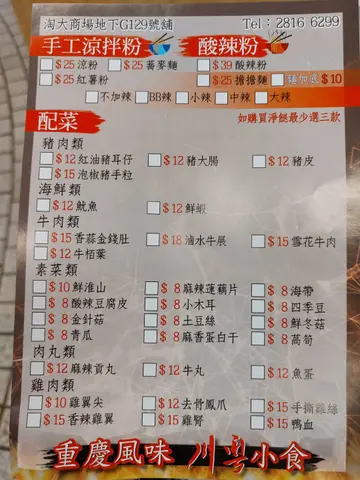 呢间店喺淘汰都开咗一段日子 今日终于叫咗嚟试下1. 酸辣粉套餐 (三款小食+饮品) $80咁我叫咗BB辣 配手撕鸡,土豆丝,泡椒猪手酸辣粉入边有菜脯,肉碎,芫茜 (应该仲有花生同葱 但我唔食所以冇要!)味道酸酸地BB辣完全唔辣最重要系好够味 好多时候一叫小辣 味道就会淡咗好多 呢间就啱啱好 手撕鸡 肉质几嫩 但冇咩味 就少少咸咸地咁土豆丝入边仲有中芹 红萝卜丝切得好幼 但仍然仲好脆而味道我谂腌同手撕鸡嘅腌料一样 所以我食唔出咩味又或者酸辣粉太重味/我叫BB辣 所以呢两款小食冇咩味泡椒猪手入边有三件 微辣有淡淡嘅泡椒味但小妹对泡椒有啲反感私心唔太喜爱整体而言味道正常 份量好足最钟意就系酸辣粉而价钱就就冇咩参考价值因为我用平台叫嘅外卖直接去叫就真系唔知咩价钱啦可惜就系佢冇堂食见佢有埋串烧如果有得堂食 即叫即烧即食应该几惹味道…查看更多