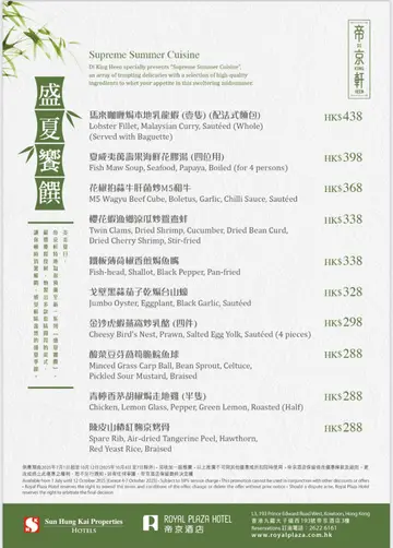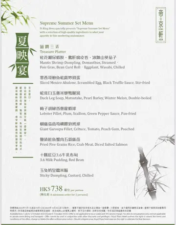 在帝京轩品尝了一顿「非遗」好客之尊 「九大簋共享宴」,内容非常之丰盛而且每道菜都很美味,是庆祝中秋节晚餐的好选择。自细就听过请你食九大簋的谎言哈哈!这次终于可以品尝到江肇褀师傅的九大簋了,打头阵是非常震撼的潮粤卤水大拼盆!内里包括有卤水鹅掌、鹅翼、豆腐、熏蹄、卤水蛋及珍肝,以潮州卤水食品制作技艺炮制这道菜式。端上台的时候那浓郁的卤水香气洋溢于空气之中!所有食材经过卤水的加持下那份香气好吸引,超喜欢浓而不俗的味道吃得非常舒服,尤其是那粉香的珍肝虽然邪恶但确是不可多得之物。头抽X.0.酱梅菜炒虾球!带出了豉油酿制作技艺及腌菜制作技艺,香甜梅菜加上豉香满泻的头抽及XO酱惹味得很,为爽脆鲜甜的虾球添上一件华美衣服,加上清甜无渣的芹菜美味道超高。陈皮薏米冬瓜炖老鸭汤!为我们带来了生晒制作技艺,这是一锅消暑滋补又好喝的汤水,鸭肉滋阴冬瓜消暑薏米祛湿加上健脾陈皮,甘香鲜甜为闷热夏日带来舒心又舒畅的味道。 冬笋花菇蚝豉扣五花腩!此菜同样用上了生晒制作技艺,通常这类型浓郁的炆菜入口会非常油腻,但这一个绝对是我吃过首屈一指的炆腩肉。虽然看上去非常入味但绝对不会过咸!所有食材也索尽了汁酱的浓郁香气,冬笋鲜香不涩蚝豉甘香鲜味,最吸引是肥瘦相间的腩肉,猪皮及肥猪肉已炆至化境入口即溶毫无腻感,至于猪肉亦是入口松化是叫人一吃难忘滋味。原笼荷香豉汁蟠龙鳝!此菜带来蒸笼制作技艺及豆豉制作技艺,鳝鱼皮爽肉滑又弹牙且没带上丁点泥味,鲜美中渗出甘香豉味那豉汁更成为同桌美女的佐饭良品呢。古法姜葱油浸笋壳鱼!仍用上粤菜传统制作技艺来炮制,炸得金黄香脆的笋壳鱼卖相有点跳脱,鱼肉多而厚骨刺极少肉色洁白又细嫩吃口甚好,配衬姜葱及豉油的香气鲜味满分。砂锅黄酒津白云吞鸡!内含的是云吞制作技艺,一大锅浓香的鸡汤味鲜不油好喝非常,加上滑溜馅鲜的云吞及香嫩鲜鸡好滋补喝罢真的红都面晒。最后还有代表香港饮食文化的焗西班牙杜洛克猪扒饭!香浓的番茄酱入口酸甜开胃猪扒也很腍滑,饭底惊喜地加入了西兰花蓉徒添清香,为焗猪带来很有新鲜感的味道。甜品怀旧合桃酥!是传统食物制作技艺的制成品,酥化香口甜而不腻味道可人。麻雀千层糕!彷效麻雀牌制作技艺创作的甜点,这手十三么虽然小相公但大家这吃得出糊来哈哈,软熟的包皮夹著奶皇跟蛋黄入口甘香甜美不错吃喔。「非遗」好客之尊 「九大簋共享宴」由即日起至9月30日供应,收费为$3448/6位、$6888/12位额外每位$578,已经包括席间3小时无限量供应汽水、橙汁及啤酒。…查看更多