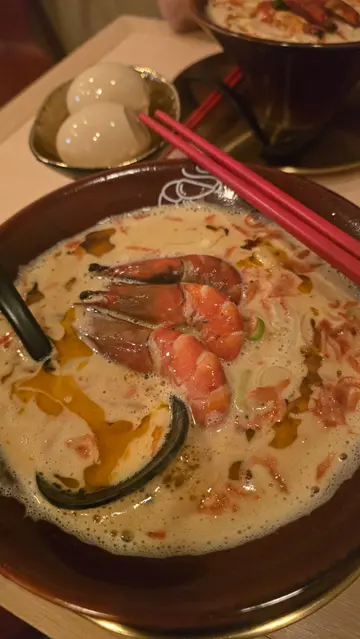 同男朋友夜晚想食拉面,就search 下港岛有边间好野未去试过,最后就拣左幕多来试。去之前唔知道原来只有一款拉面,好彩我又钟意食虾,所以就照入去试。门口有少少隐蔽,我地兜左2次先见到佢个门口🤣好好彩,因为去到已经夜夜地,所以完全唔需要等位,但都系因为夜得制,好多小食都已经卖晒,所以只系单点左个面来试。一入到去餐厅,首先就已经比佢个阵劲香的虾味吸引住,根本唔洗睇餐牌就知道佢一定系卖虾汤拉面。加埋墙上边的涂鸦,即刻开启全感官沉浸式虾汤拉面之旅,由视觉、嗅觉到味觉完全被虾味攻陷,可以encore!全间铺独沽一味卖酱油虾浓汤面!我系第一次来食,侍应够晒细心,递点餐纸时会逐项同你讲解,又会送上支装水!等咗阵,碗招牌虾汤拉面一上枱,已经香到不得了!汤底橙橙红红又极其creamy,再附上樱花虾加葱花!最正系——侍应会即席喺你面前淋上热辣辣嘅虾头油!真系香到无朋友,大家都知唔好食的虾汤底系会好腥,但佢地系一啲腥气都冇,饮第一啖汤鲜到个天灵盖都震,口感浓到黐唇,我尼d 钟意食浓味野的人系觉得very goooood.面条我拣咗拉面,个人并不喜欢刀削面,拉面咬落烟韧挂汤,每条都索满虾汤精华,同个汤底好夹!虽然碗面只得三只虾,但全部用酒浸过!入口酒香回甘🍶,重点系已经剥好壳,连虾尾都剥得好靓,手工非常好!溏心蛋都系用酒腌过,个黄笃开流晒心,岩晒我尼d 流心蛋控!✨成间店装修都好有和风feel🎏,卡位松动唔会顶手顶脚,侍应哥哥仲好贴心💖,会主动问你要唔要加饭——重点系加樱花虾饭系免费!呢个著数唔执真系对唔住自己!可惜我个胃唔争气,一碗面已经饱到顶上心口,唯有下次再挑战加饭食法啦!…查看更多