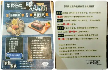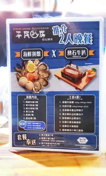 平日晚餐,叫了热石牛扒,200g肉眼及200g牛板腱,附送蕃茄汤,蕃茄汤摆明茄膏加茄汁,酸到痛不欲生。牛肉个样几好,但啲肉衰过大家乐铁板餐。无论肉眼定牛板腱,一啲牛味都无!肉质好似擦子胶,难以吞下。酱汁竟然是死咸现成照烧汁,如果旧肉质素正常,其实用盐已经好好食,又点解会选用浓味汁呢?随餐附上既前菜,一睇就吾开胃,衰过以前小学嗌啲饭盒。如果无心机整,不如吾好送,好寒酸。因为餐点无野饮,加了$12要特饮,用糖水加水就叫特饮!你杯野如果系送既,就算,但系我加左$12,比少少诚意好无!另外,加了一只焗蚝,🙂臭既!最后,隆重介绍,利用优惠价加既$88两只西班牙珍宝生蚝。来到既时候,好震撼,好大只,食落味道正常,有少少海水味,都creamy既。但系!我翻到屋企之后,就肚疴,疴水个只~大家参考下啦,祝大家好运👍🏻…查看更多