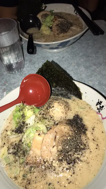 Counter其实只得几个位⋯ 午餐时间,冇得坐counter,要坐后巷,折枱折櫈~ 睇住后巷d街喉呀,洗碗,等等⋯感觉真唔多好⋯ 冬天还好,夏天唔多妥⋯唯一好,播住日文歌!Menu ~朋友叫既黑亨拉面。少少中伏既感觉⋯ 极普通。选了浓味,都系好淡味道⋯ 我既黑胡麻拉面。选了角煮,算入味。但汤底好重味精⋯ 食完要不停饮水⋯加左做餐,有饺子同罐装汽水。煎的还好,煮的就不要了⋯试过一次就算了~不会再食⋯这个价钱可以有好些的选择~…Read More