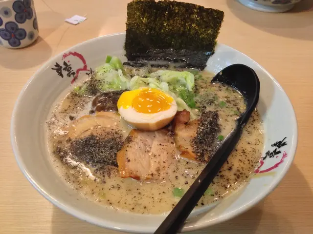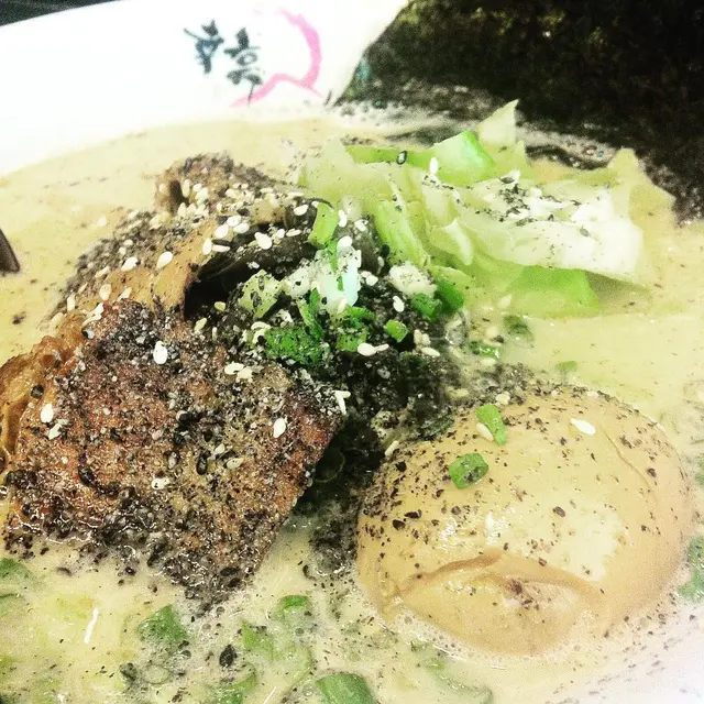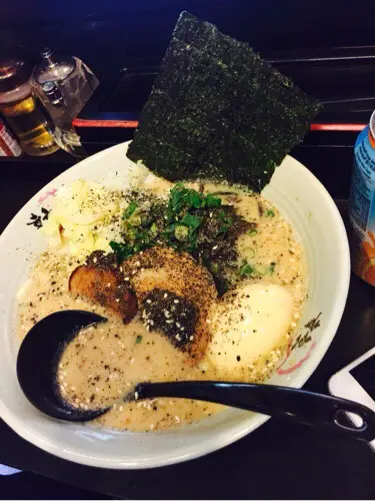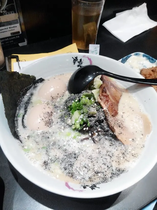 見假期, 外出走走~ 行行下見到間細細地的拉麵店~ 上網睇下先知原來 來頭不小~ 即刻坐底食~ 叫左個 黑胡麻拉麵, 一口炸雞 , 炸軟殼蟹沙津~落單紙可以選擇湯的濃度,麵身的軟硬度, 可以依個人口味點自己喜歡的拉麵炸軟殼蟹沙津-好有驚喜~ 因為我見到成隻軟殼蟹, 唔係得d腳~x雜菜沙律同軟殼蟹一齊吃,好香口,好爽脆,卻毫不油膩一口炸雞, 炸粉不厚而且不油膩, 雞肉好滑又爽口, 值得一讚最後出場~ 黑胡麻拉麵 加糖心蛋 *重豬骨湯底味加上 胡麻好香, 個湯不太油膩, 麵條夠爽正合我意糖心蛋一流!! 一定要試~查看更多