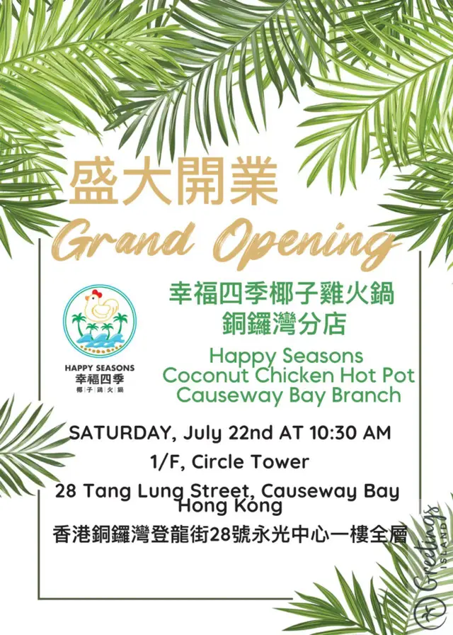 幸福四季椰子雞 (永光中心) (铜锣湾) 网址: https://s.openrice.com/QrLS0dpy600 地址: 香港銅鑼灣登龍街28號永光中心1樓 电话: +852 29181228