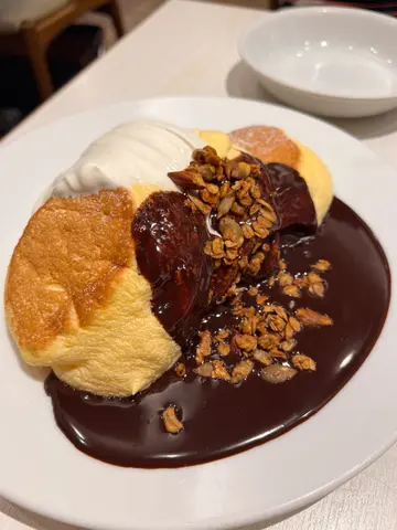 有啲贵,百几蚊三件好厚嘅松饼,松软,轻盈充满空气感,口感软滑,但系觉得味道相对比之前嘅话呢,面粉味重啲,蛋香味淡咗好多,雪糕唔错,呢间总体都系偏贵,而且要+1喔,冇之前咁好食啦。