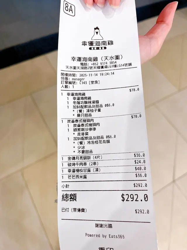 幸運海南雞 (天水围) 网址: https://s.openrice.com/QrLS0YfiF00 地址: 香港天水圍天湖路2號天耀廣場LG1樓LG14號舖 电话: +852 21808019