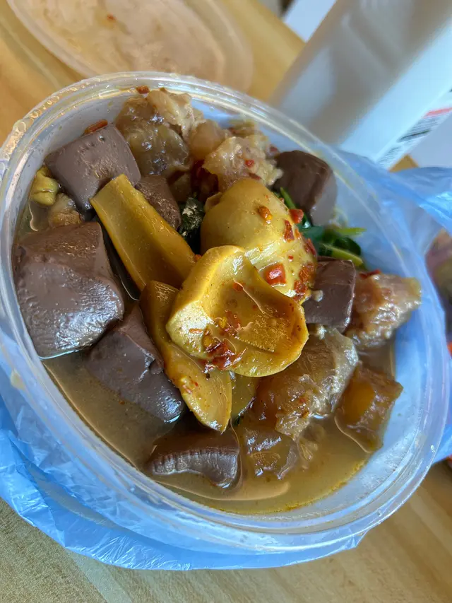 中午時分,街市人山人海,除了一批去買餸煮飯的顧客外,當然不少得一班搵食一族。今日來到康泰車仔麵,又引起我的車仔麵人。店舖少少,人龍長長,餐牌眼花撩亂。好在麵檔提供窩心的車仔麵配搭,正正有我最鍾意嘅蘿蔔朱紅和豬大腸,勉強了我左揀右揀的煩惱。加左辣汁同腩汁好好味, 三十一蚊外賣仲要唔使加一蚊外賣盒 ,蘿蔔四大舊,豬紅炆得入味,豬大腸略嫌皮薄吾夠爽,不過洗得好乾淨,一啲都唔腥。大大碗咁嘅價錢我覺得好抵食。其實仲想試埋佢嘅煎釀三寶, $16/8件我覺得OK喎。不過得我一個人都係唔好咁大食啦,下次再試!查看更多