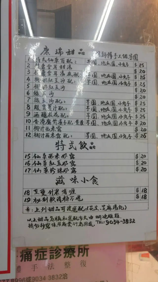 一大班朋友食完晚飯唔想咁快解散朋友仔話附近有間好食又抵食的糖水店於是又拉大隊去食糖水原來她提議的糖水店是康瑞涼茶我一直好想試它自家製的手工芋圓等了大約半個鐘 ... 終於可以入座喇 !!!糖水有 13 款,中式糖水為主以雪耳湯、紅豆沙、綠豆沙等配芋圓、地瓜圓、小丸子 ...價錢 由 HK$20-$25,好抵食 !!!儍媽點了碗這兒的招牌 ... 凍的特式仙草百配 HK$25有仙草、地瓜圓、芋圓、珍珠、小丸子、薏米配上椰汁西米露店家自家製的地瓜圓和芋圓味道分明,口感煙靭軟糯仙草凍味道濃郁,入口甘甜滑溜溜糖水甜度適中,配料豐富,滿足度滿分的糖水 !!!試了兩啖囡囡的 ... 凍的桂棗雪耳甜湯底配芋圓、地瓜圓和小丸子 HK$25雪耳爽口,糖水清甜滋潤,味道不錯的** 以上分享是以我的口味、喜好和情況作出分享及感受,一試 / 合用與否請自行決定查看更多