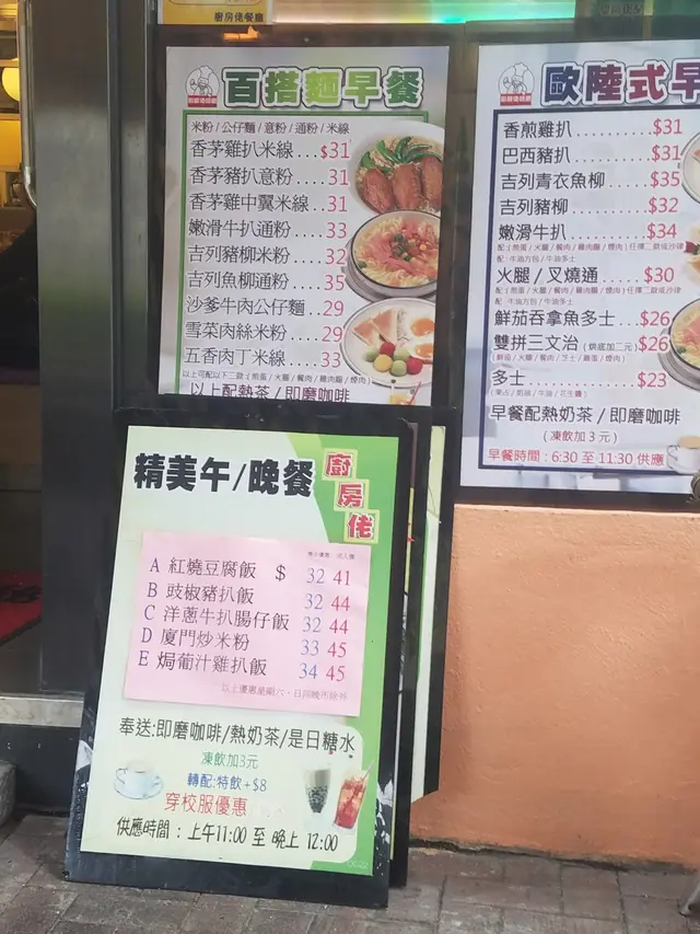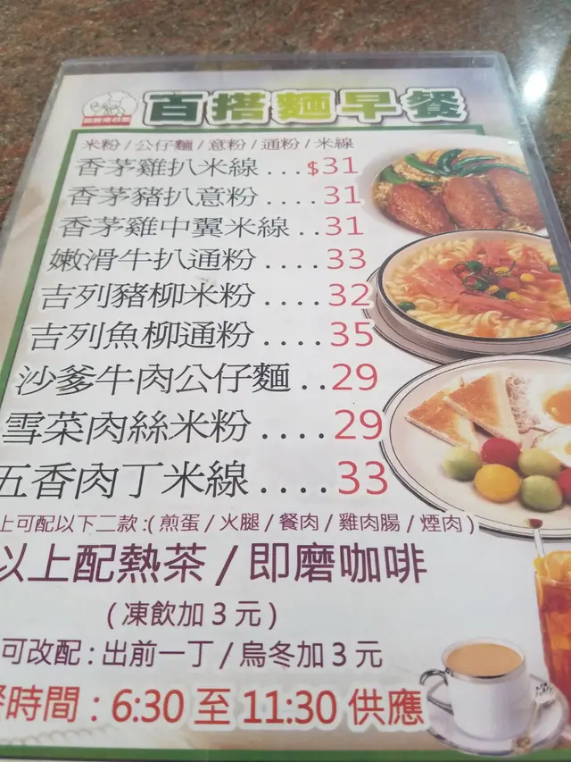 工作中早餐,大家來咗呢間海邊嘅商場餐廳,除室內座位,仲有室外座位方便想睇景或吸煙人士,我哋入室內坐, 裝修比較姣,半圓粉紫梳化,一啲都唔茶餐廳麻甩佬feel早餐都係港式茶餐廳早餐!唯一特色係米通粉叫了:香茅雞扒通粉($31)雞扒醃得鹹香入味,煎炸得香脆,米通粉我第一次見,比普通通粉爽口彈牙,好好味,湯底鹹香,又加啲娃娃菜,多啲纖維健康啲!好味火腿熟蛋:火腿正常,熟蛋雖然無咁滑,不過熟啲安心啲熱檸茶:鋼杯存熱,不過好多時食晒食物都未攤凍飲,茶底濃唔澀,茶餐廳水準同事食:叉燒通粉:凍奶茶:凍檸茶:餐肉火腿方包:嫩滑牛扒通粉($33)香茅雞中翼米粉加煙肉蛋:食物比想像中好!店員勤快豪爽,好快手!在港式中的驚喜查看更多
