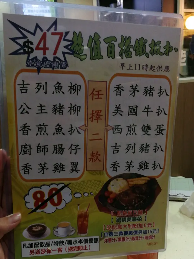 晚餐唔知食乜好, 突然諗起好耐冇食鐵板餐西餐,於是就嚟到樓下的廚房佬搵食。呢度正在選擇多, 喇沙粉麵, 日本拉麵, 咖哩飯, 中式小菜, 焗飯, 就連我鍾意食嘅鐵板餐都有,價錢平, 一個迷你鐵板餐成為47蚊, 飲品可以以半價加購, 簡直抵!查看更多