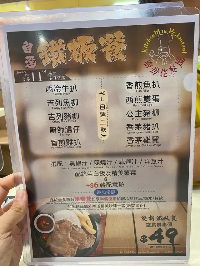 🌍今晚去🚶廚房佬🏠食飯🍽介紹下😋有咩好食👍先:自選鐵板餐🍳:吉列魚柳🐟、香茅豬排🐷、白飯🍚、黑汁🧂、沙拉🥗;先講食物,沙拉🥗做頭盤開胃先,魚柳🐟外脆內滑,豬排🐷入味,咬一下肉汁爆🎆出嚟,重點講呢個黑汁🧂,呢個黑汁🧂好野味中辣,送飯🍚一流,一試難忘🤩。10星🌟為滿分一定比9星🌟鐵板雞扒炒烏冬🍳:今次冇用鐵板上🍳,怕過熱麵質🍜改變,食物方面;雞球🐓、紅蘿蔔絲🥕、椰菜絲🥬、烏冬🍜、豉油🧂;雞球🐓嫩滑,烏冬🍜有彈性,加埋豉油汁炒🧂...香氣十足😋👍。10星🌟為滿分一定比8星🌟小食雞翼🍖:上脆醬薄炸,炸出嚟勁脆,雞翼🍖本身入味😋,完美小食👍👍。10星🌟為滿分一定比9星🌟叫左2杯飲品:西米紅豆🥤冰及菠蘿冰🥤,唔多講,簡單野,好飲👍。10星🌟為滿分一定比7星🌟☂️以上為個人意見☂️🙇‍♂️(如有意見分歧者煩請見諒)🙇‍♂️查看更多