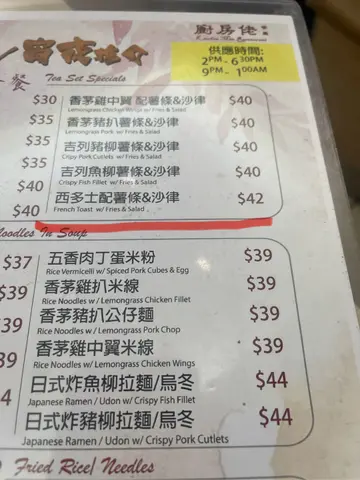 同屋企人睇完戏念住去厨房佬食个晚餐,嗌了香茅猪扒饭+香茅鸡扒饭结果上完菜发现,无论鸡扒 or 猪扒都是冻的、好干身,而白饭又冻又松散,似隔夜饭又未加返热原本仲念住带屋企人黎食一次揾返旧时回忆,以前读书时一放学就会过黎食晚饭。过完今次真系不了,61蚊唔算贵,但咁即质素仲不如去隔离吉野家食,起码啲饭同肉仲有温度明白侍应讲年初二厨房唔够人手。只有5个餐可以嗌都唔紧要,但起码都要比食客见到你有比心机煮个餐啦,而唔系求求其其杯洗餐具既水仲热过碟饭