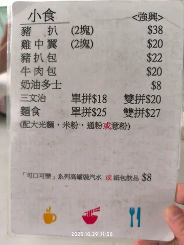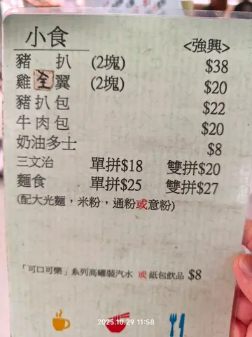 你对上一次于大排档食野系几时呢?呢度没有华丽的装饰。没有高级食材。没有舒适坐位;但偏偏有一定既捧场客.... 以我系其中一个。如果你问我有咩驱使你去大排档,究竟系爱还是责任?系爱❤️ 爱上自力更生的感觉,怀念以前的香港味。今次黎到强兴咖啡室,叫左一个猪扒面加一罐汽水🥤,盛惠:HKD35。真材实料,抵食😋😋猪扒肉质鲜美滋味,没有太多松肉粉/味精,猪扒有少少实肉有咬口,猪扒似返猪扒味道,让我食得安心多了... 从细节看得出重点,餐厅既餐具用餐纸包好一份匙及叉,卫生,干净,细心,从呢点都看得出老细果份坚持✊