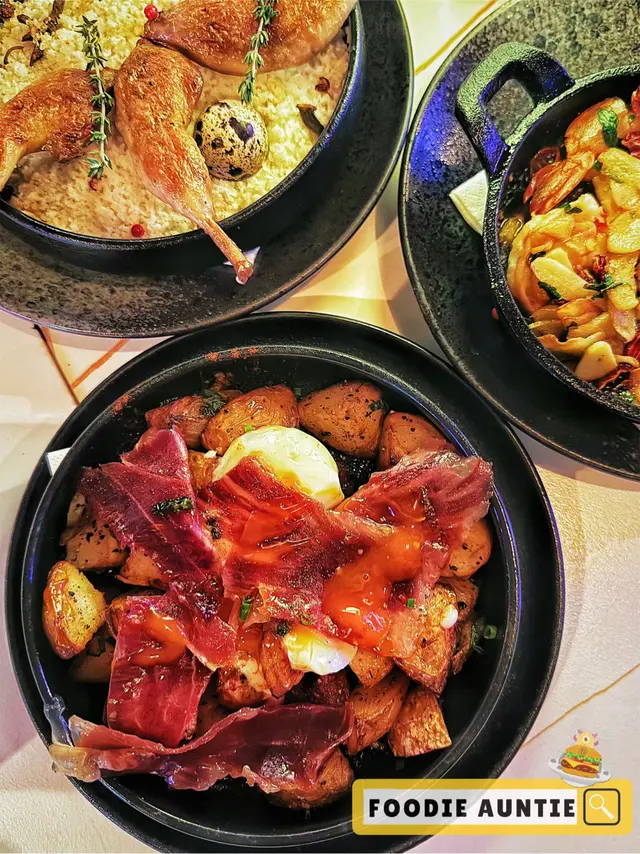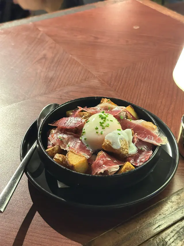 巴塞隆拿脆薯粒配流心蛋及辣肉腸粒 伴 36個月橡果飼黑毛豬火腿