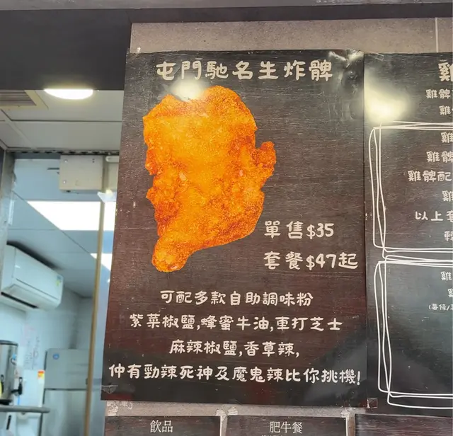 網上見到有人評論話呢間係世一生炸雞脾,突然間心血來潮,突登渣車過黎屯門買黎食!果然無失望😋😋😋😋😋😋😋一咬落去真係聽到「炸炸」聲!啲皮好脆啊!入面啲肉又唔會炸乾哂!仲好juicy!有唔同嘅味粉選擇,例如紫菜椒鹽,蜂蜜牛油等等,我呢個婇辣之人就揀左麻辣椒鹽,對我個人黎講就唔覺得好辣,不過因為我無落得好重手!因為怕落得太重搶左啲味!無揀錯啊,微辣得黎又脆,真係令我同老公回憶起1x 年前第一次喺台灣食豪大大嗰種驚豔嘅感覺!