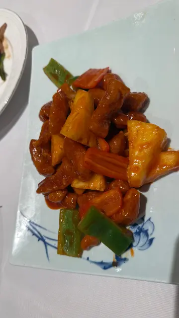 在某平台定位有折扣,今次就一行6人黎试吓。1.麻香口水鸡,少少麻少少辣,鸡肉唔嚡。2.星州金沙脆鱼皮,浓浓嘅咸蛋黄香,鱼皮真系好香脆。3.瑶柱海味杂菜煲,普普通通。4.神州菠萝咕噜肉,咕噜肉炸得几好,甜甜酸酸。5.西湖陈皮粉排骨,没有陈皮味,似糖醋骨多啲。6.双葱炒安格思牛肉,洋葱和大葱惹味,牛肉软滑,但份量唔多。7.海皇西施泡饭,番茄粒,白菜粒,酸酸地嘅番茄汤味。8.甜品-蛋散,大大件算松化。9.最后红豆沙都系唔太特出。整体喺有折扣优惠下就不能有太多要求,如果以正价我应该唔会再食