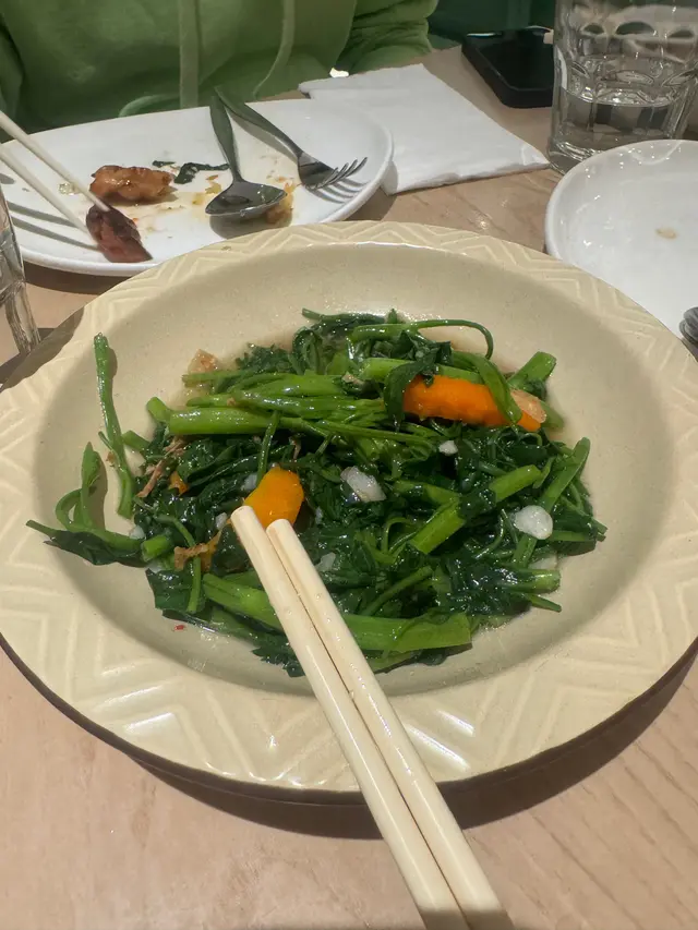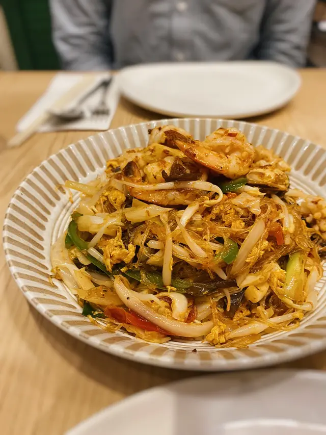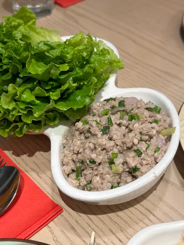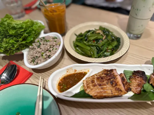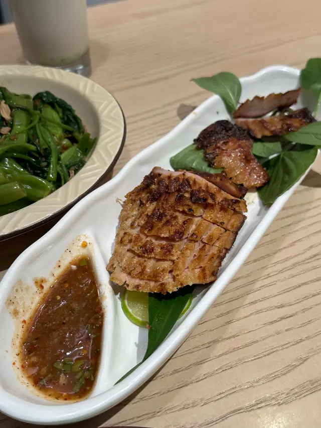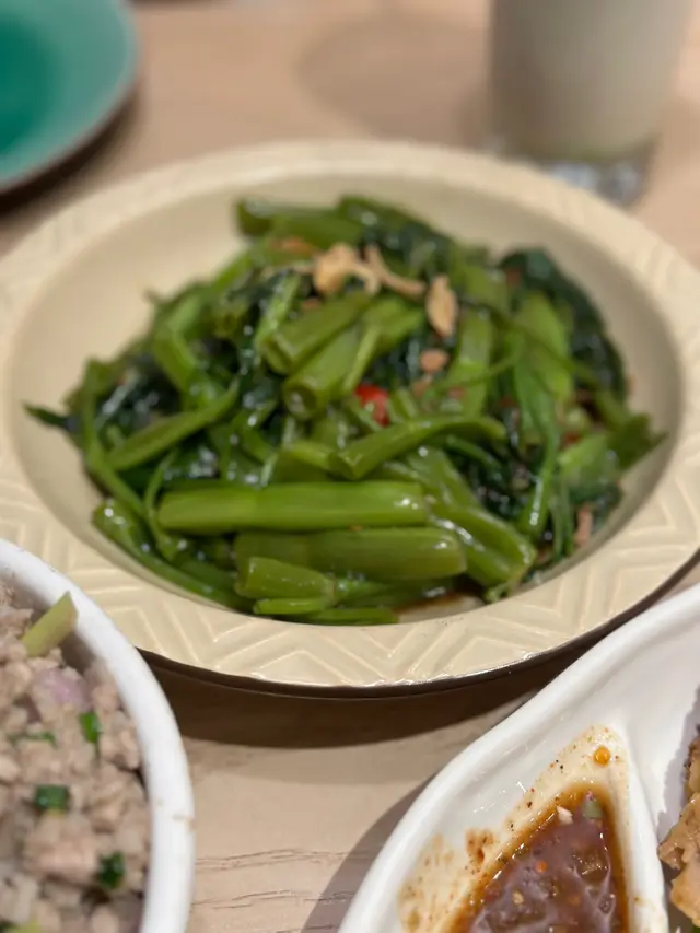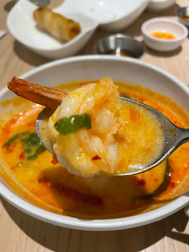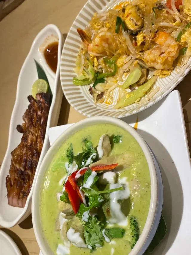 觀塘一日到黑都好多人,好多時間都要排隊,最近太熱唔想係外面排隊,就選左間係商場入面既泰菜,諗住坐得舒服D。門面唔大但原來入面好大,佢係L 形佈局所以睇唔到。甘我地都比較肚餓,就叫左個晚巿二人餐,睇黎都幾多野食,份量都唔細!首先有個小食拼盤,每樣小食都配唔同既醬汁,個沙嗲醬做得好好,配串燒一流。春卷炸到脆身,入面係蝦肉都幾正,隻汁就係似泰式辣醬甘,幾開胃。米紙卷就不過不失,無話好好食,串燒幾惹味,肉質仲係滑既!唔錯!冬陰公湯酸辣味重,仲有好大隻蝦仁,好開胃,依個讚!炒雜菜黎講個配搭都幾特別,係蓮藕,秋葵,木耳,粟米筍,豆角等等,味道唔錯有少少鍋氣,而蓮藕炒到爽脆,係幾好食既,夠曬清淡健康!海鮮咖哩隻汁係似咖哩蟹甘用蛋汁收芡,味道係甜咖哩,配搭上唔同既海鮮,都真係唔錯。就甘輕輕一數都有5種海鮮,青口,蟹肉,魚片,蝦,魷魚等等,依個菜可以撈飯吃,幾下飯👍蒜香骨就略嫌失色,雖然好大舊但係肉質比較硬,骨位比想像中多,肉既話得幾舊。蒜味亦未有好特出,面頭既炸蒜份量本人覺得唔太夠,未食完碟菜下面既肉已經無曬蒜味。整體黎講加一大約500蚊既話有d 貴,可以一試,如果再試既話可以試炒野,隔離既炒飯聞到好香應該唔錯。…查看更多