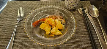 活龙虾配龙虾汁,简直系海鲜控嘅天堂!龙虾肉质鲜嫩,铁板烧到啱啱好,保留咗鲜甜嘅原味。龙虾汁浓郁得黎带点微辣,淋喺龙虾上面,味道层次超丰富,令人一试难忘🤤活南非饱鱼 🍥4.6/5 ⭐️