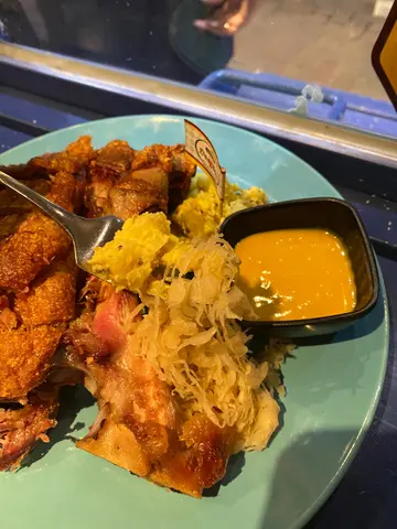 份量超级大,绝对要至少2人才可以解决它。皮烧得脆口之余带有少少微咸,肉亦保持湿润,不会感到很柴。配以酸菜及芥末酱一流。 薯仔以蛋黄酱制成,风味十足