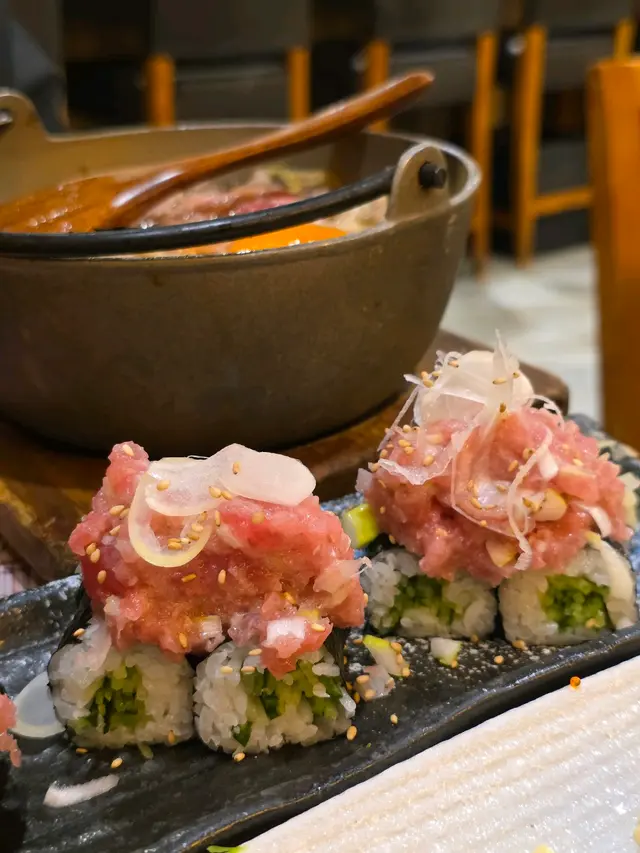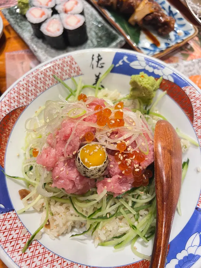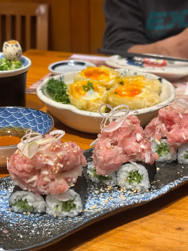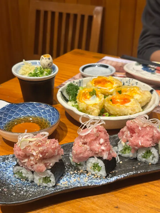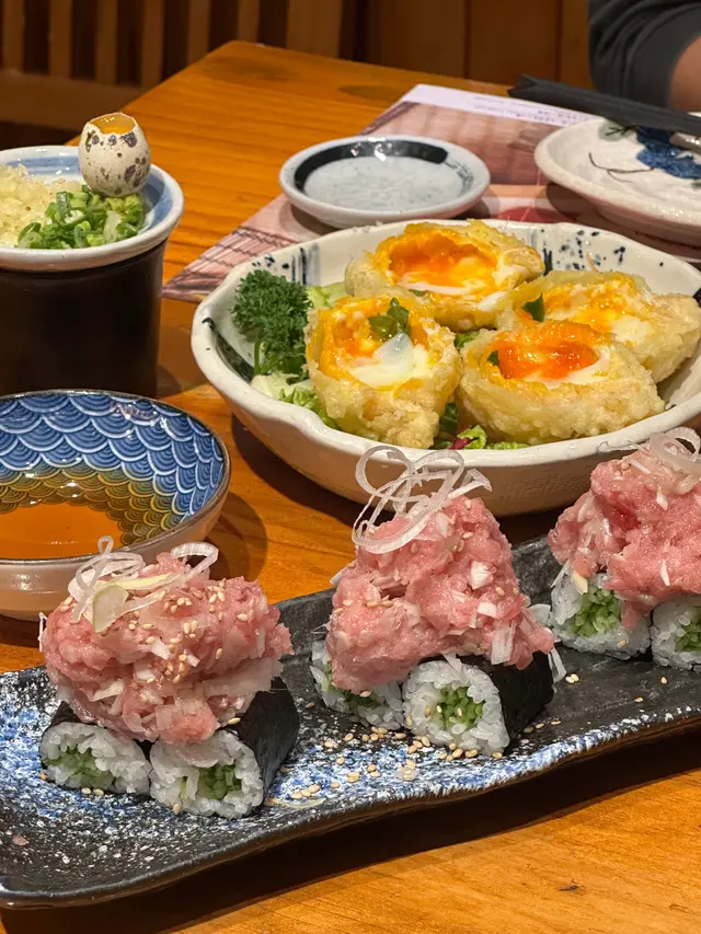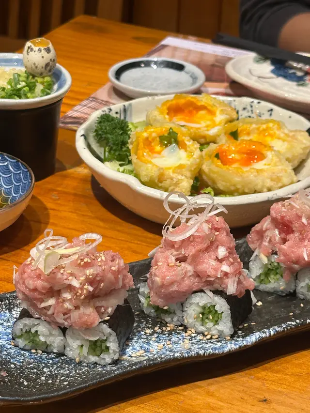 大埔歷史悠久的日式居酒屋餐廳裝修以和風木系為主餐廳供應大量新鮮的魚生和壽司今次點了人氣之選《鮮蔥吞拿魚腩茸山掛卷》$138必叫必叫!新鮮打成的蔥吞拿魚腩茸滿滿放在小卷壽司上,有如三座高高的山,大滿足!新鮮美味!蔥味很香濃!《溫泉蛋天婦羅》$55必叫!很有驚喜的炸物天婦羅!外面是脆脆的,內是流心的溫泉蛋,真的夠晒特別!《芥辣鐵板牛扒》$134足料大大塊的牛扒,煎的很軟熟,牛汁也很香濃美味!《抹茶麵-冷麵》$55經典美食!是抹茶味的冷面呀!點上冷面醬汁!很惹味!查看更多