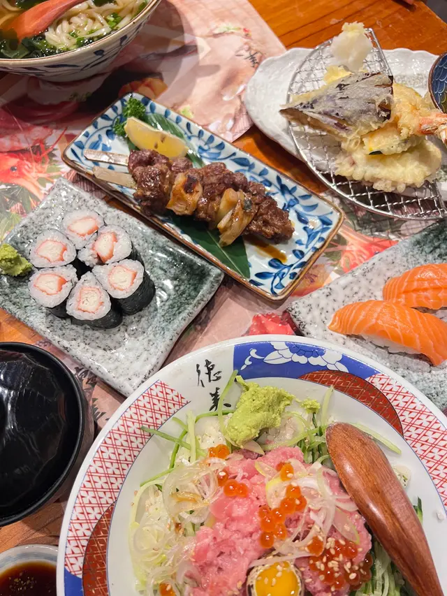 日本食物 一向係我地嘅首選,今晚唔想煮飯,第一時間諗起想食德美,因為見朋友食完讚不絕口門外裝修充滿和風,入到去充滿家庭式居酒屋感覺 🍢安格斯牛肉串安格斯牛肉肉質鮮嫩多汁,口感滑順,每一口都能感受到肉的彈性和京蔥的清脆,兩者搭配得相得益彰🍢七味燒雞腎雞腎燒得非常惹味,有咬口爽脆🍣蟹柳卷酥脆的紫菜外皮帶來愉悅的口感,與蟹柳的柔軟形成鮮明對比🍣三文魚壽司三文鱼口感嫩滑,肥美而不腻🍜天婦羅熱烏冬定食沙律🥗用上新鮮蔬菜🥬及水果面豉湯雜錦天婦羅蝦🦐番薯🍠南瓜🎃茄子🍆粉漿控制恰當,炸得鬆脆巨碗日式熱烏冬烏冬口感煙靭 🍚魚子蔥吞拿魚腩茸丼 一上檯不禁嘩一聲😍丼飯有蔥絲、三文魚子、青瓜、吞拿魚腩蓉配上一隻鵪鶉蛋蛋黃撈勻吞拿魚腩的肉質鮮嫩,入口即化,搭配細膩的茸狀口感,讓人感受到海鮮的鮮甜新鮮的蔥花不僅增添了色彩,還帶來清香,讓整體風味更為平衡查看更多