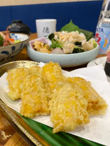 今日嘅飞机货是象拔蚌, 乍听还在担心2人吃不完, 姐姐介绍呢款三河湾象拔蚌体形较细, 2个人都食得哂。 象拔蚌上枱已分一边刺身, 一边火炙。刺身起哂刀花, 靓得黎又爽脆 新鲜火炙部份是象拔蚌头, 有d 似润。 都几得意。 原来2食仲有一碟天妇罗炸胆😂 将象拔蚌嘅胆做成天妇罗,外表脆脆,入面有鱼腐的感觉, 又几得意㖞。 唔使300蚊食到飞机货,仲要有2食(3种食法) 真心抵食。食天妇罗的话,一定要试试呢个天妇罗粟米粟米好甜, 粉浆唔厚, 大人小朋友都会钟意。鱼生刺身丼呢个系定食黎,包左丼饭, 汤, 前菜同甜品盖系饭上面的鱼生有带子,三文鱼,油甘鱼和生虾和大量鱼籽,肥美肉厚鲜甜,好似用鱼生埋成了一座小山,多到连d饭都睇唔到呀