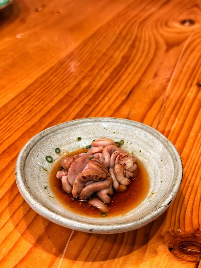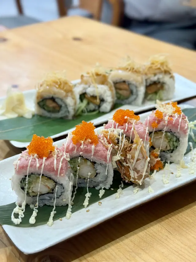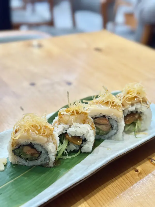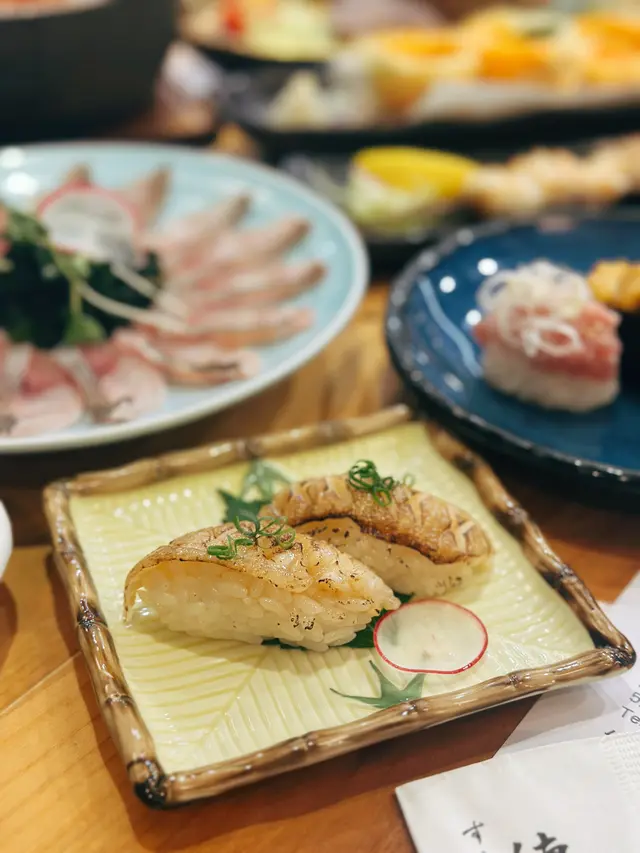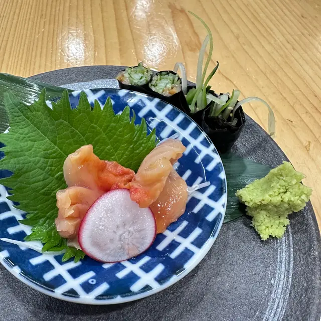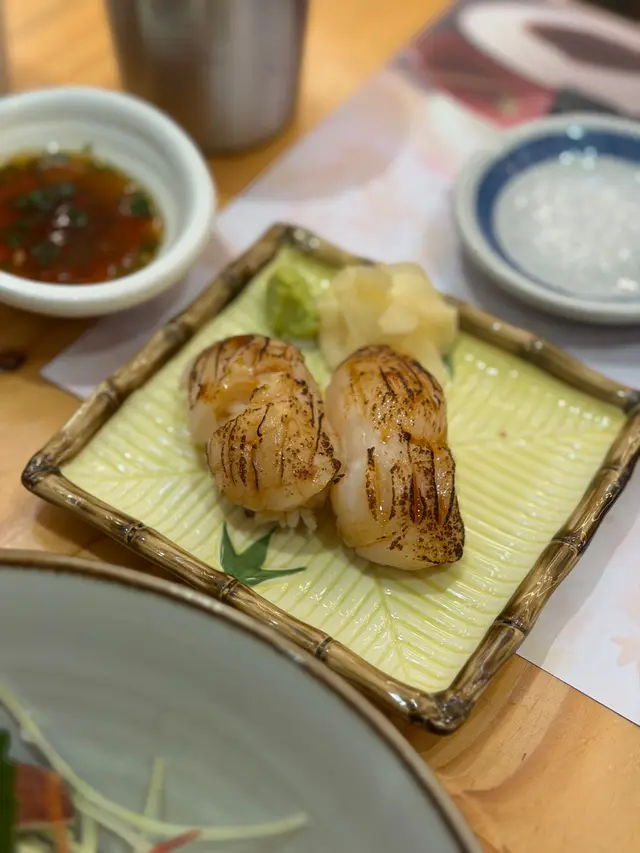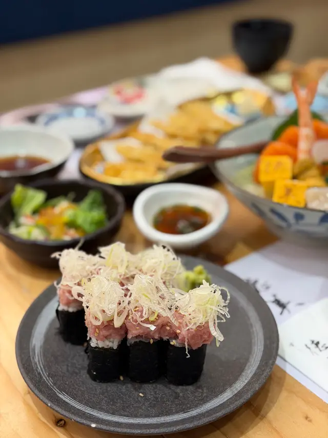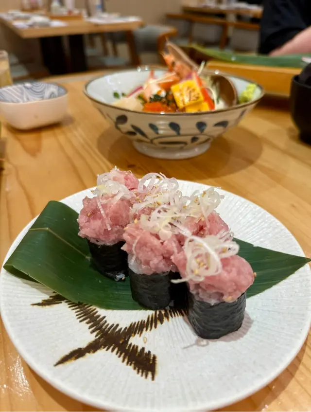 冷盤三文魚刺身(5片) $69、火炙帆立貝壽司(2件) $45、蔥拖羅茸卷 $100。三文魚刺身好厚切,火炙帆立貝壽司口感略帶彈性。蔥拖羅茸卷,拖羅茸與青蔥比例平衡,滿滿拖羅茸好滿足😌