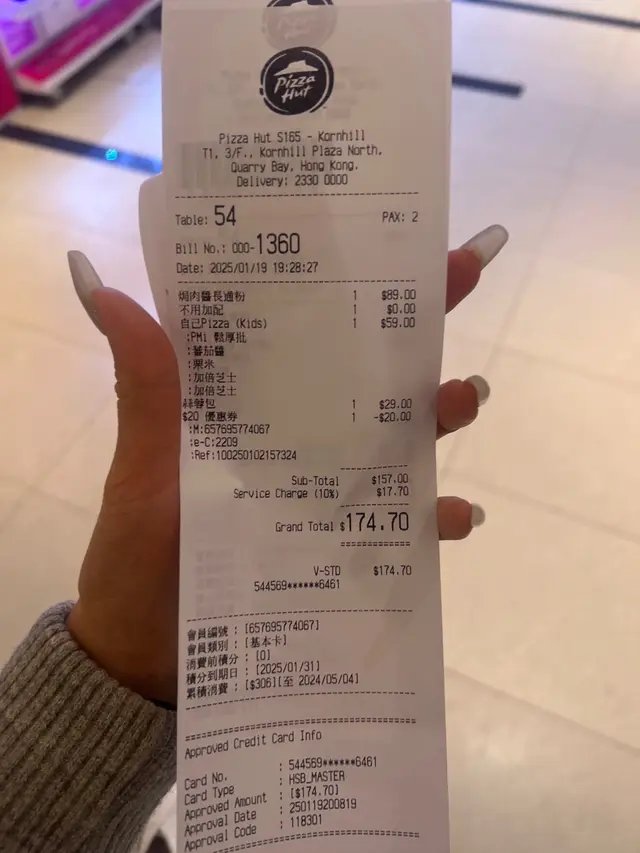 I had no idea this Pizza Hut location at Kornhill Plaza was quite new (after looking at other reviews). The last time I dined at a Pizza Hut location in Hong Kong was probably well over 20 years ago as I usually get my pizzas delivered or picked up. I had a great experience on Sunday night eating with my boyfriend. We were super hungry, and the reminiscent smell from our childhoods brought us back here. We order a large Half & half pizza, Super Supreme and Italian Delight, with Stuffed Crust. We added a half slab of bbq ribs and cream soup puffed pastry. Everything came super hot and tasted just like it did back in the old days. We saw a lot of happy families dining and it brought back a lot of childhood memories. I definitely want to come back to try the Cheese Fondue set next time The staff were super friendly and helpful, bringing out requested items promptly! Seating was relatively full for Sunday evening, but it was definitely a plus side that we didn't have to wait other than for our food. We used a $50 coupon voucher from the Pizza Hut app, and I remember seeing multiple family's using vouchers valued between $50-70. Overall experience was great …查看更多