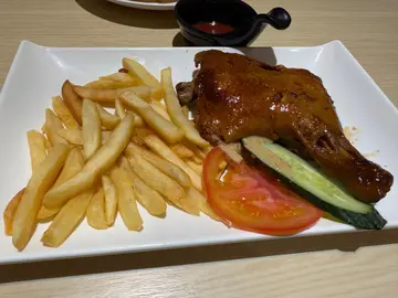 行经苏杭街,好Random发现呢间装修几靓嘅茶餐厅,于是入去食个下午茶!奶茶茶香与奶味比例拿捏得恰到好处,入口顺滑,不会过涩,绝对系一杯出色奶茶😍😍😍豉油王鸡髀亦令人惊喜,鸡肉嫩滑入味,豉油味浓郁但冇掩盖鸡本身嘅味,好唔错👍 薯条方面就正常,冇咩特别。