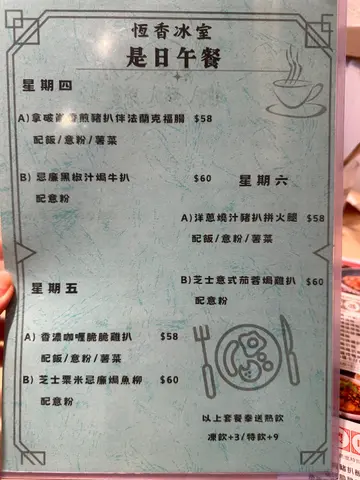 细个成日跟屋企人食恒香老婆饼,原来而家有恒香冰室啊,经过几间分店都好多人食,要预少少时间等位🥢葱油蒜香鸡扒爆蛋捞饭先生必食嘅,葱油好香,同猪扒、蛋汁、饭一齐食好夹🥢香浓咖喱牛腩饭牛腩好腩,咖喱汁超香唔辣,最正系佢用咗炸薯角取代薯仔,更香口吸引🔸老婆饼点少得恒香名物老婆饼呢,冬瓜蓉馅不甜不腻,加埋酥脆饼皮,新鲜出炉热辣👍🏻🥤热奶茶 冻奶茶见佢仲有几间分店,价钱唔贵,啱打工仔食晏,不过预时间排队