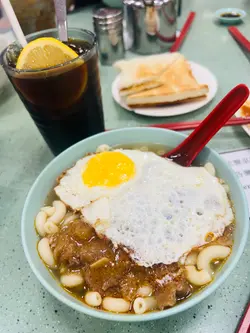 八点几同啲邻居跑步跑到去大埔工业村,跑完九点几已经32度,大家话想食早餐回一回血,咁就去咗大埔墟街市熟食档。佢哋有啲就试隔离鱼蛋粉,另一个就同我一样食呢一间茶档。其实就冇乜选择就系面餐或者单嗌多士。为咗等埋其他人食嘢,就嗌咗个奶酱多同奶油猪食住等。个奶油猪就够晒酱,但系就唔够脆,呢个有少少败笔。之后就叫咗个面餐同冻柠啡。早跑完步再饮杯冻柠啡确系醒神,另外嗌咗太阳蛋配沙嗲牛通。太阳蛋都煎得够脆,个沙嗲牛肉都几有诚意,有落蒜头落去炒过,牛肉都唔嚡有啲厚度。