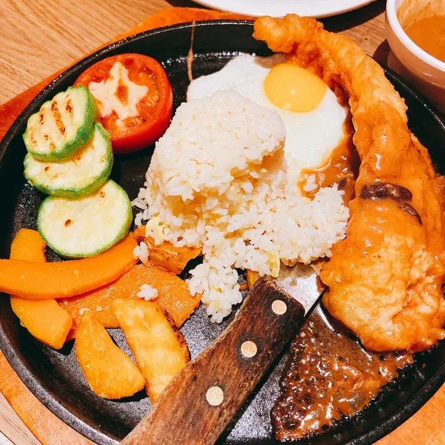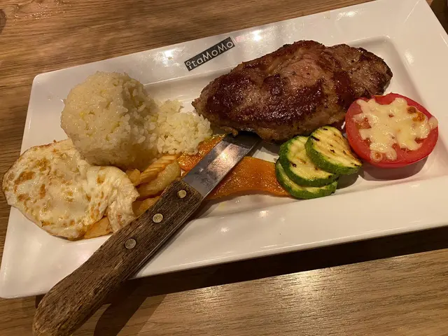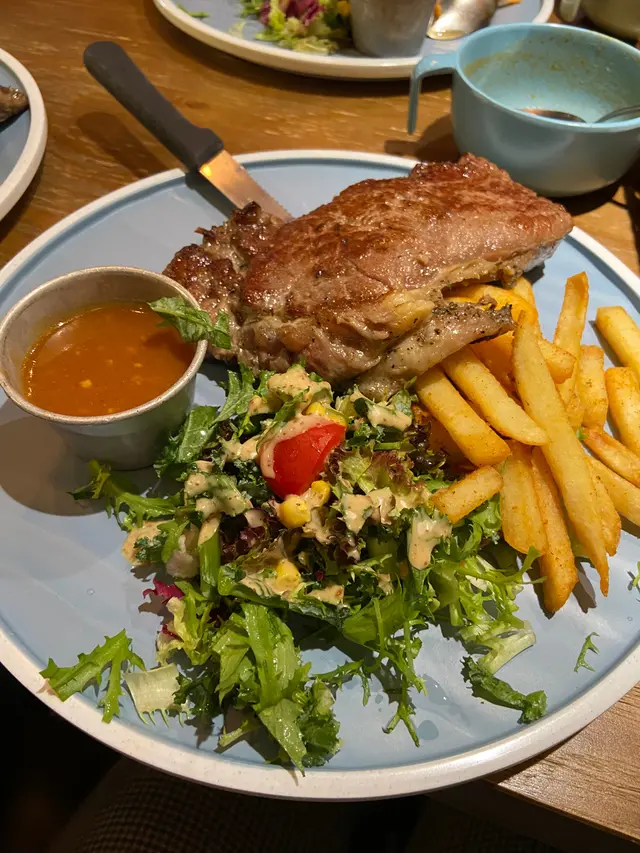 牛扒份量大件 有配菜芝士蕃茄加薯條 仲有飯送 不過牛味道唔夠 牛扒煮得有啲過分熟