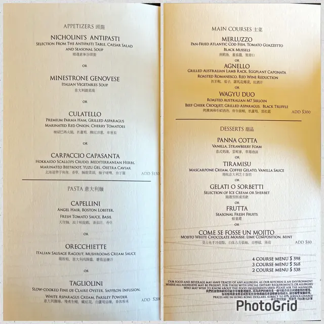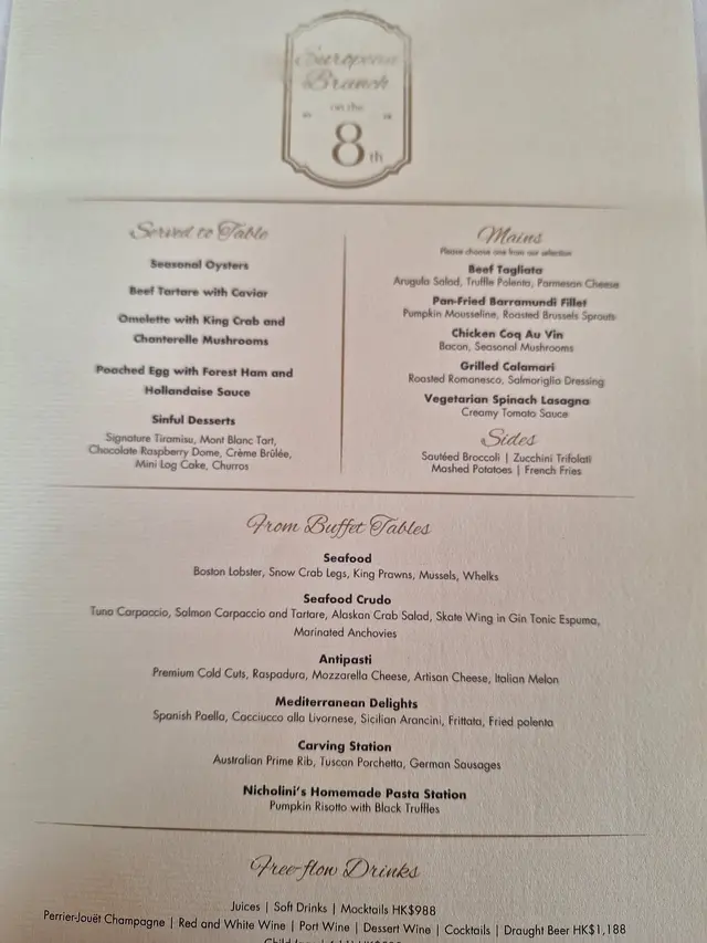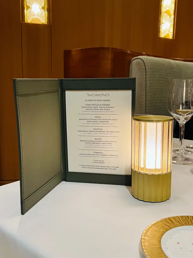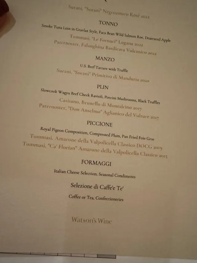 NICHOLINI'STOMMASI WINE DINNER8度西餐配8款紅白另配特調雞尾酒每一道西餐都非常出色,重量級份量,每一道菜都有品酒師講解,個人特別喜歡主菜牛扒餐廳一貫優質服務配,金鐘夜景,外面酒吧區有樂手現場演奏🎶一餐性價比非常高嘅西餐🍷🍷👍🥂SURANI SORANI NEGROAMARO ROSE 2022SMOKED TUNA LOIN IN GRAVLAX STYLE, FAVA BEAN WILD SALMON ROE, DEAERATED 🍷APPLE TOMMASI LE FORNACI LUGANA DOC 2022🍷PATERNOSTER VULCANICO FALANGHINA 2022MANZOU.S. BEEF TARTARE WITH TRUFFLE SURANI 🍷SORANI PRIMIOTIVO DI MANDURIA 2020PLINSLOWCOOK WAGYU BEEF CHEEK RAVIOLI, PORCINI MUSHROOMS, BLACK TRUFFLES 🍷CASISANO BRUNELLO DI MONTALCINO 2017🍷PATERNOSTER DON ANSELMO DOCG 2017PICCIONEROYAL PIGEON COMPOSITION, COMPRESSED PLUM, PAN-FRIED FOIE GRASS 🍷TOMMASI AMARONE CLASSICO DOCG 2019🍷TOMMASI AMARONE RISERVA CAFLORIAN 2015FORMAGGIITALIAN CHEESE SELECTION