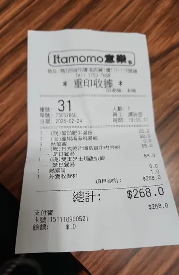 本人刚晚上到餐厅堂食,我问该女侍应是日餐汤是中汤还是西汤,之后对话了一阵,我话我要白汤,该侍应语气不满地说“你头先又话红汤”我话我无讲过,我话唔紧要我朋友未叫,佢叫白汤咪得啰。由于我系两人用餐,之后其中一张枱被拉走,唔紧要,张单都拎走埋,唔紧要,我出去埋单时再同佢讲番,我觉得无问题。好啦,我出去埋单时,我企左一阵系cashier,个女侍应问我企系度做乜,我话埋单,佢问我张单呢,我就解释一次点解我无左张单,佢听完唔明,就转身同佢一个侍应讲“我唔明佢讲乜,你去搞掂佢”态度之恶劣无下一次帮衬。…查看更多